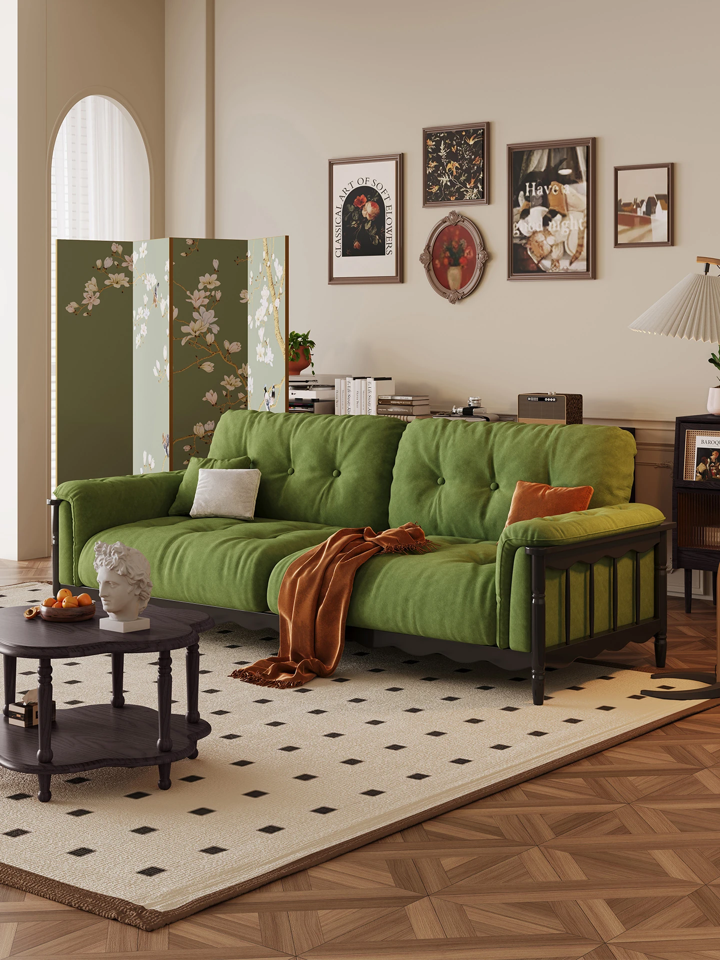 フレンチヴィンテージスタイルのベビーサテンソファー、深みのあるグリーンでおしゃれなリビングルームにぴったり!新作の木製マルチシートソファ。家族や友人とくつろげる素敵な空間を演出します。