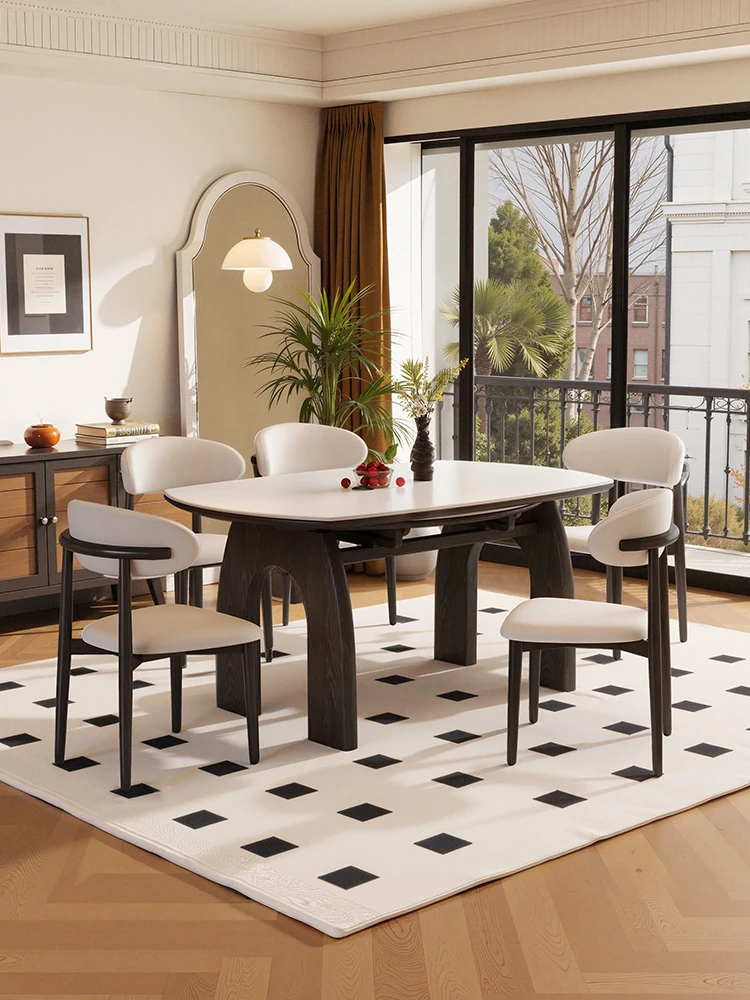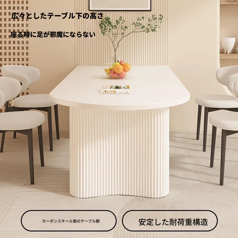 モダンでシンプルなフレンチクリーム風の半円形ダイニングテーブルセット、小型住宅に最適な岩板製の食卓。スタイリッシュなデザインで、おしゃれな食事空間を演出します!