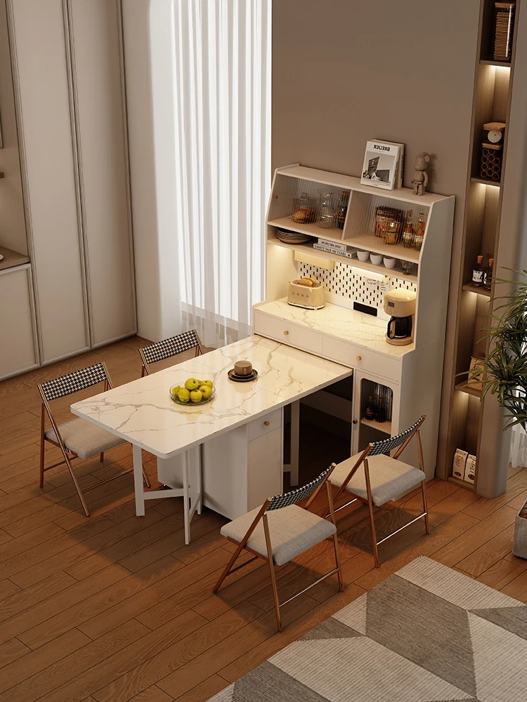 クリーミーな風合いのロックパネルダイニングテーブル&サイドキャビネット一体型、シンプルでモダンな小型リビングに最適!伸縮可能なテーブルと高品質の木製チェアが、家族の団らんをより楽しく演出します。