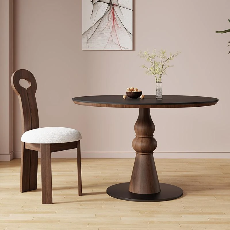 フランス製ブラックウォールナット無垢材ラウンドテーブル - シンプルでスタイリッシュな小型住宅向け、ヴィンテージ感溢れるダイニングテーブル。バルコニーやリビングのリラックススペースに最適!