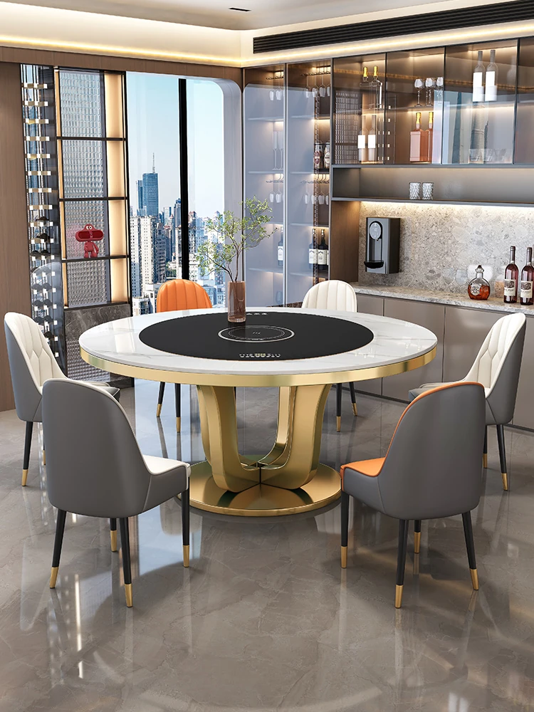 軽奢感漂う多機能岩板ダイニングテーブル - 電磁調理器付き、円形デザインの電動回転卓、温かい料理を楽しむための理想的な食卓。家族や友人との素敵なひとときを演出します!