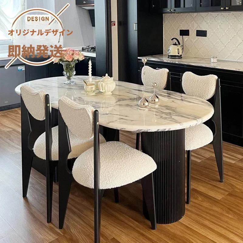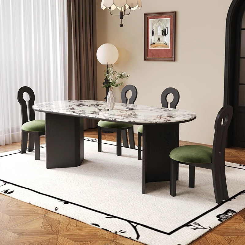 フランス風レトロデザインの天然木製全支え大理石ダイニングテーブルセット|リビングに最適なオーバル型ボッテガ・ヴェネタ風テーブル&チェアコンビネーション。高級感あふれるインテリアにぴったり!