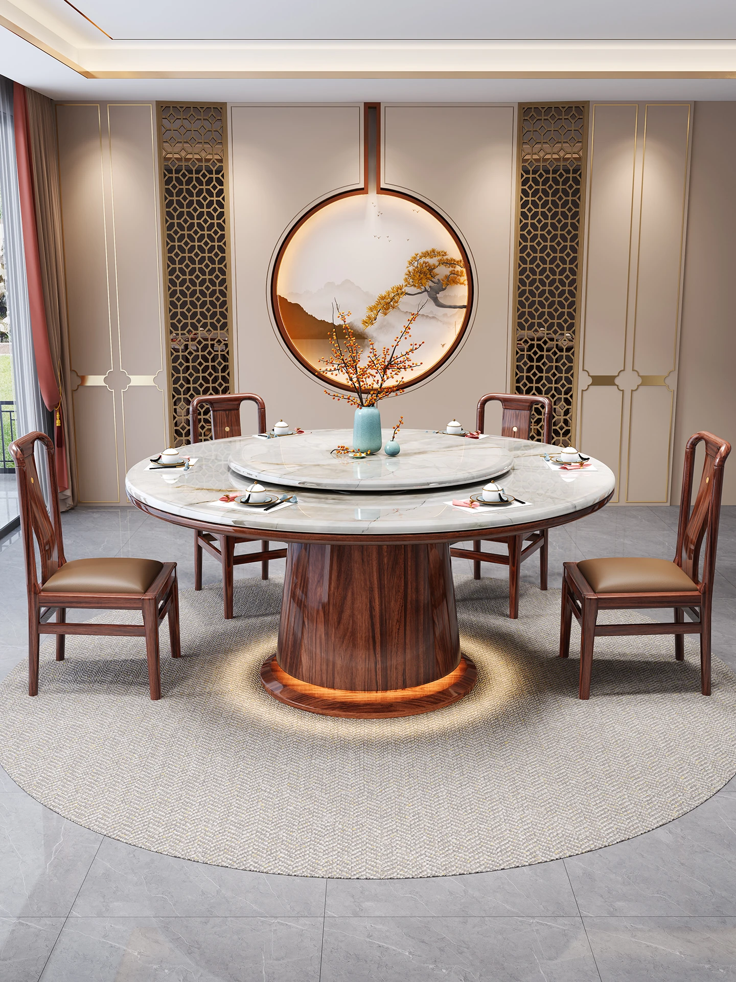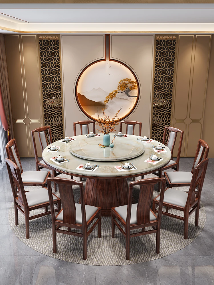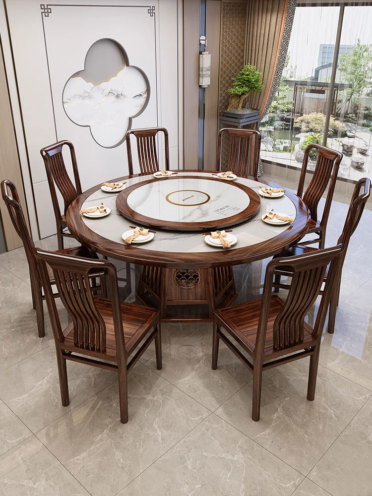 新中式スタイルの軽奢華大理石ダイニングテーブルセット - 家庭用・レストラン・個室に最適!高級ウッディな黒檀材を使用した大きな円形テーブル、回転プレート付きで使い勝手抜群。おしゃれで快適な食事空間を演出します!