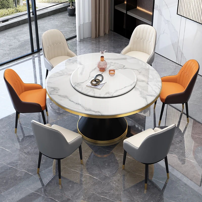高級大理石円形テーブルとチェアのセット - 中古風デザイン、別荘やレストランに最適!贅沢なダイニング体験を提供し、便利な回転トレイ付き!軽やかな高級感をお楽しみください。
