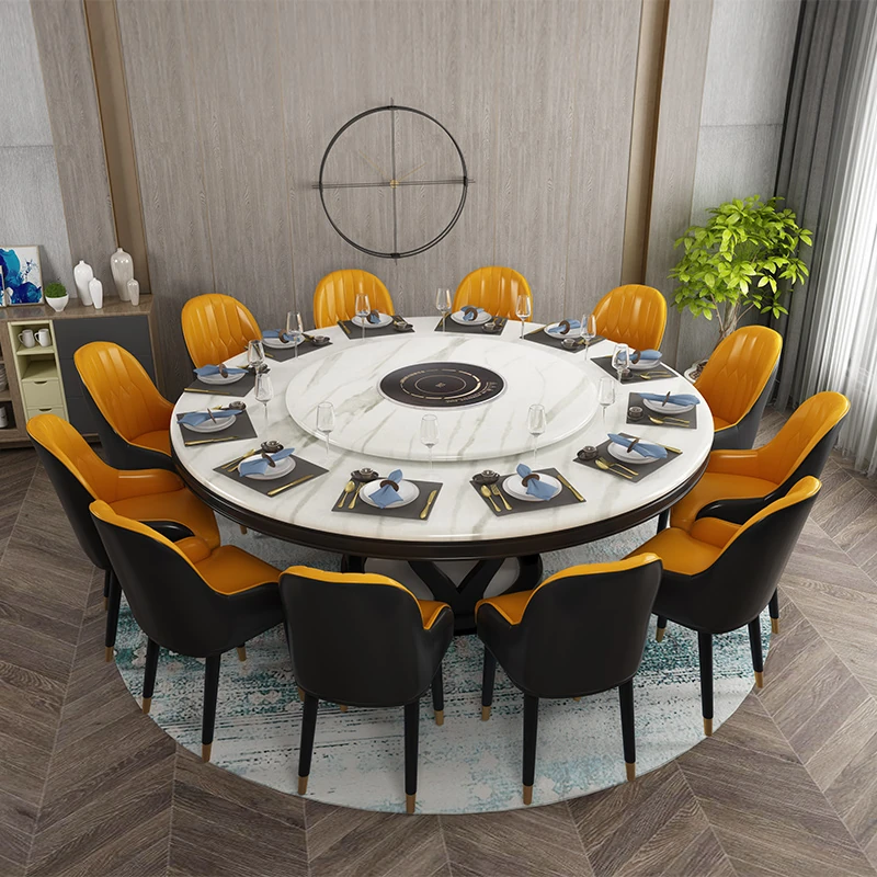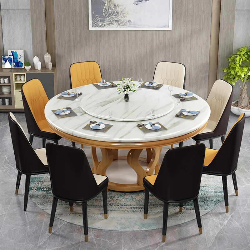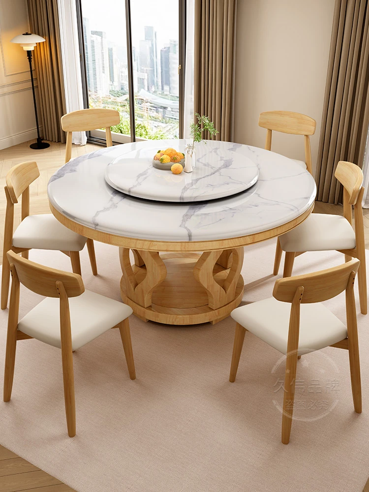 モダンでシンプルな大理石ダイニングテーブルセット|ラグジュアリー感漂う丸型実木テーブル|電磁炉付き回転テーブル|家庭用に最適な食卓空間を演出!