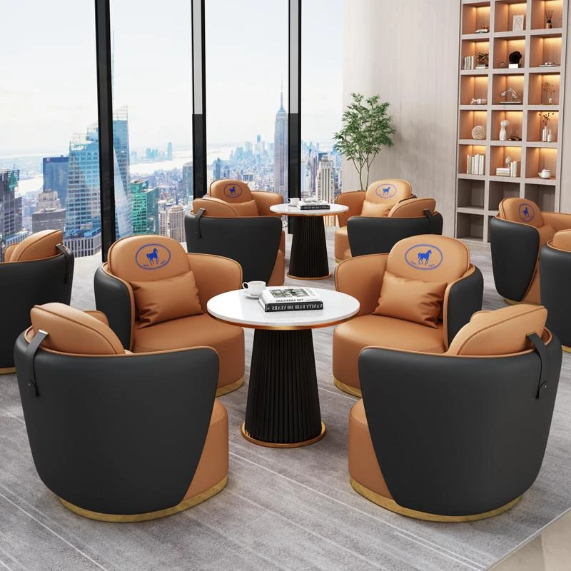ラグジュアリーな現代風の会議テーブルセット - ホテルロビーや接客エリアに最適なエレガントなソファと交渉用テーブル。お客様を魅了する洗練されたデザインで、商談をスムーズに演出します。