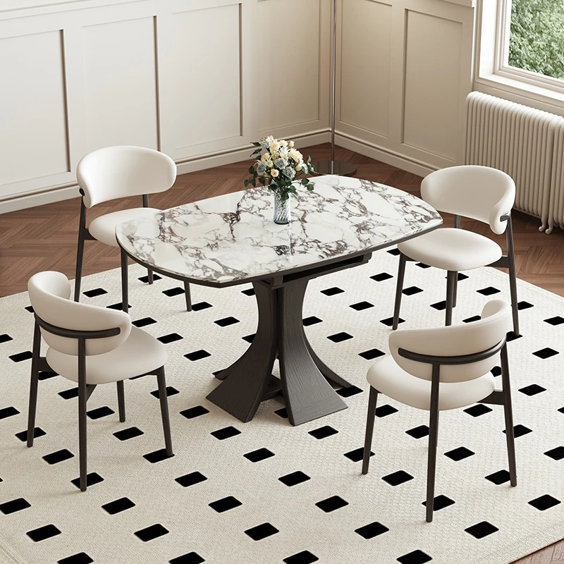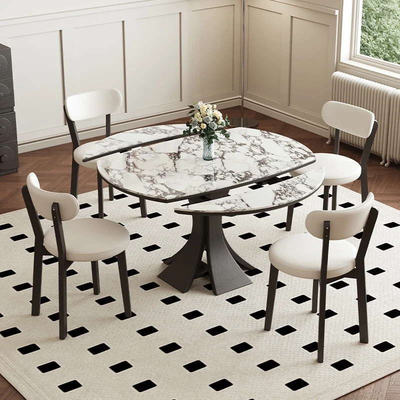 フランス風レトロ大理石ダイニングテーブル - 家庭用リビングに最適!伸縮自在な四角形と円形の2WAYデザイン、天然木製の高級ボッテガヴェネタスタイル。おしゃれで機能的な食卓を実現!
