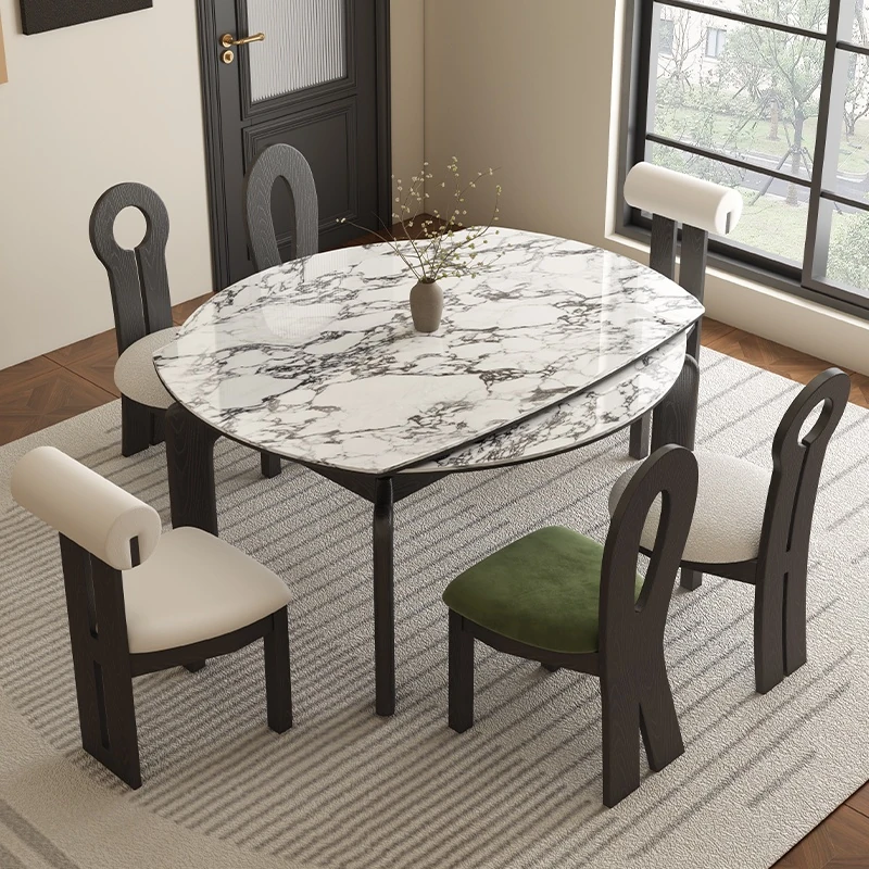 レトロスタイルのブルガリ大理石伸縮式テーブル!ホワイトアッシュ製の折りたたみ式ラウンド&スクエアダイニングテーブル。限られたスペースでも優雅な食事体験を提供します。