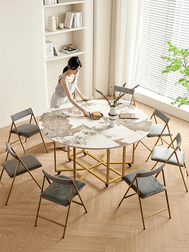 狭いお部屋にぴったり!シンプルで収納可能な折りたたみ式ラウンドダイニングテーブル&チェアセット。軽やかなデザインと高級感あふれるストーンテーブルで、毎日の食事を特別なひとときに。