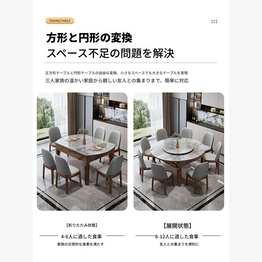 北欧風の無垢材ロックボードダイニングテーブルセット|伸縮可能な小型家族向けコンビネーション|シンプルでモダンな四角・丸両用デザイン!おしゃれな食卓で特別なひとときを。