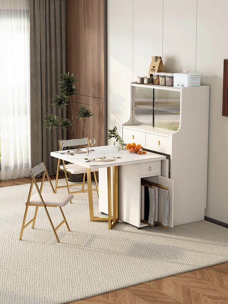 小スペースでも大活躍!軽やかな高級感を演出する岩板製の食卓テーブル一体型折りたたみサイドボード。伸縮可能で多機能、狭いお部屋にもぴったりのコンパクトデザイン!