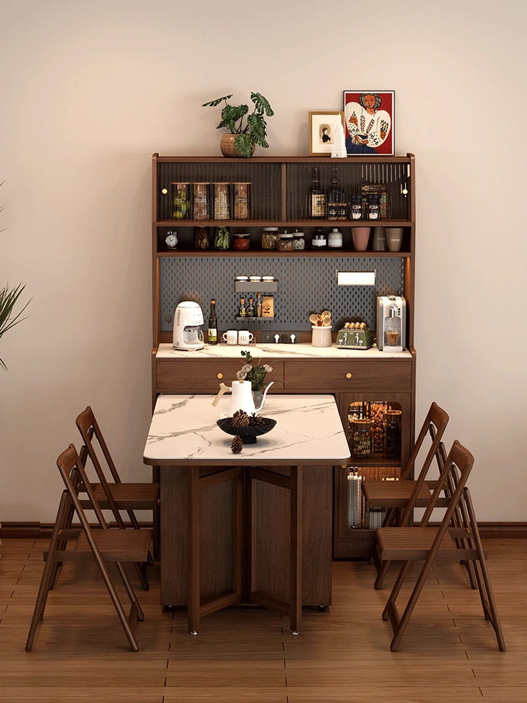 2025年新作!折りたたみ式ダイニングテーブル - コンパクトな家庭向け、収納力抜群のカウンターキャビネット一体型。アンティーク風の岩板と伸縮可能な無垢材使用で、スタイリッシュな食卓を演出!