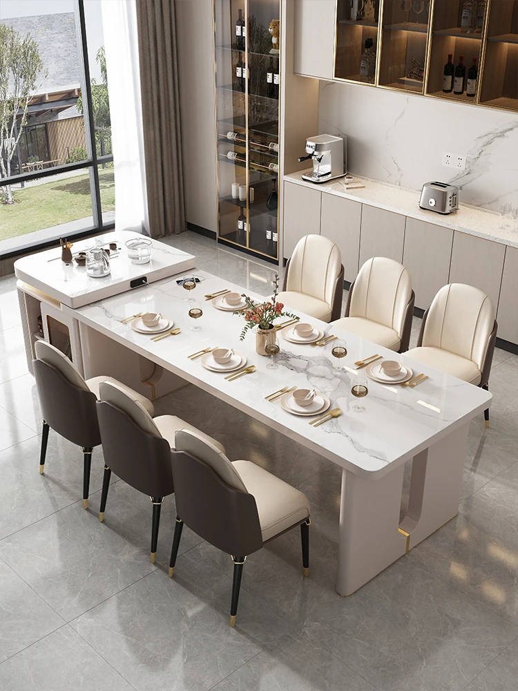 2024年新作!伸縮式岩板ダイニングテーブル - 小型住宅に最適な軽奢多機能デザイン、IHクッキングヒーター付きバー台でおしゃれな食卓を演出!