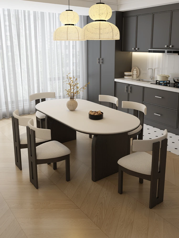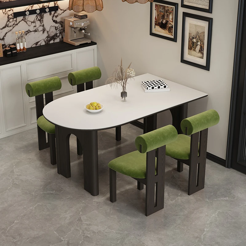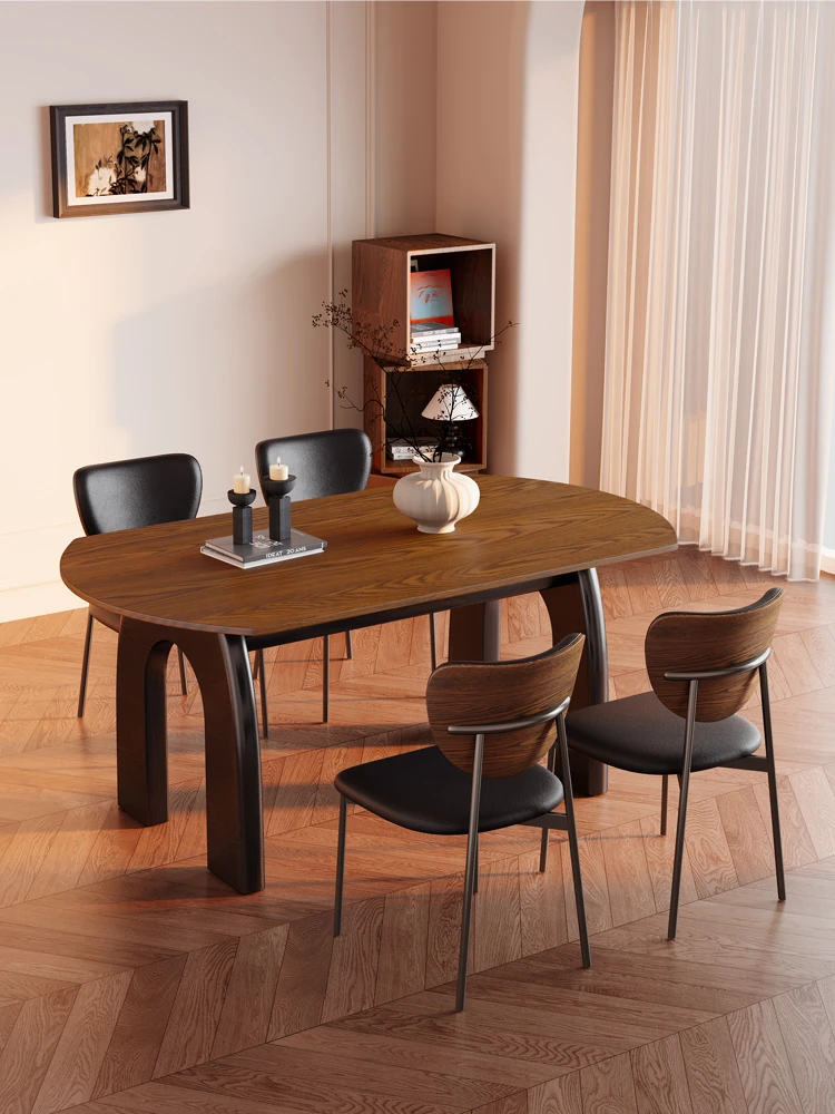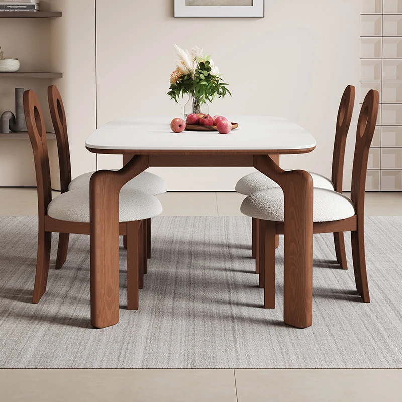 French Vintage Solid Wood Dining Table with Rock Slab Surface - Rectangular Design for Small Spaces, Featuring Elegant Elephant Legs and Ash Wood Chairs - Perfect for Stylish Home Dining!