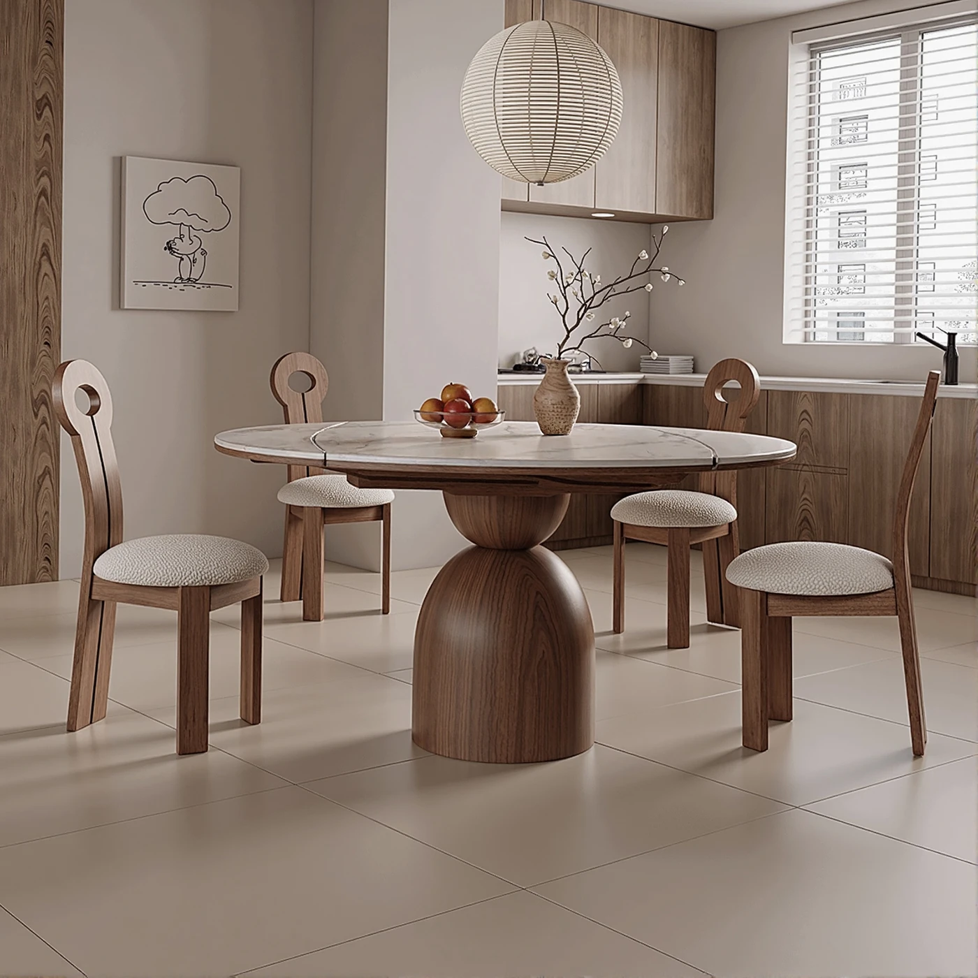 Nordic Cherry Wood Expandable Dining Table with Rock Plate - Compact Solid Wood Folding Table and Chair Set for Small Spaces, Perfect for Cozy Dining Rooms