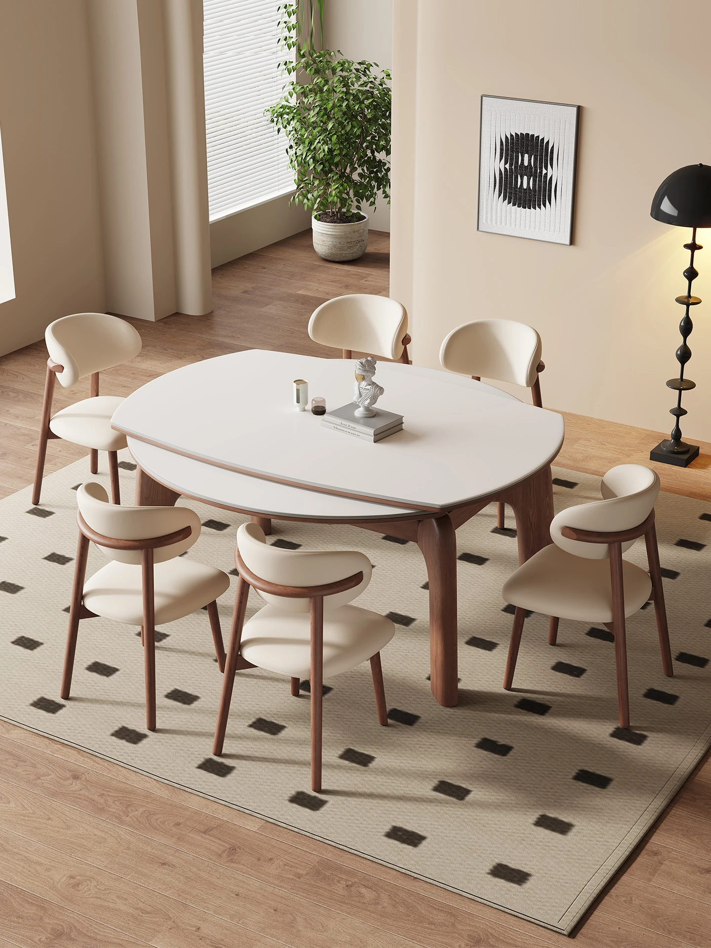 Creamy Wind Round Dining Table with Elegant Waist - Modern Minimalist Design for Small Spaces, Pure White and Black with Rotating Tray, Perfect for Home Use