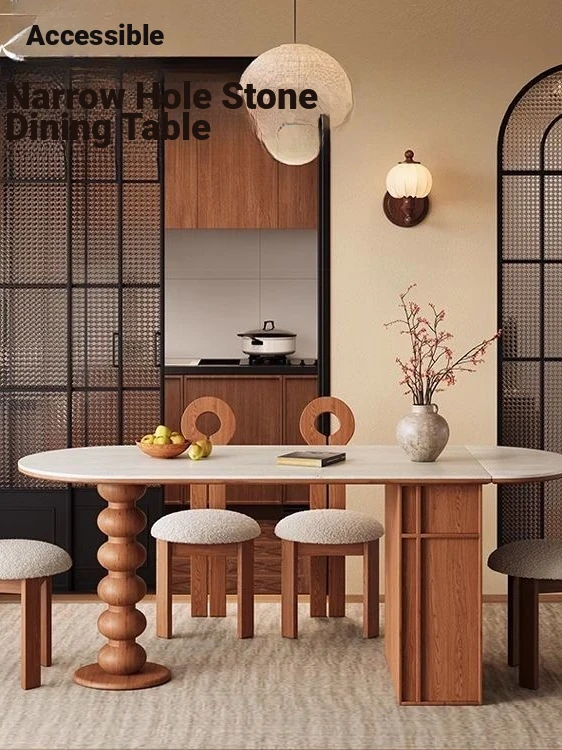 Vintage Solid Wood Oval Dining Table with Natural Stone Finish - French Retro Style Foldable Table for Small Spaces, Perfect for Cozy Homes