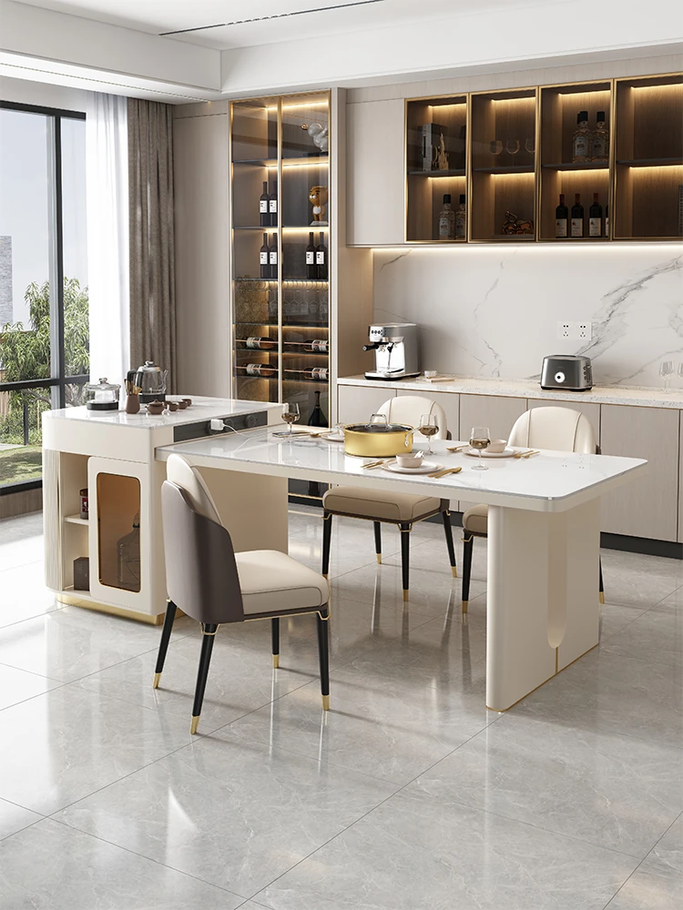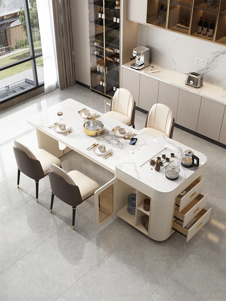Elegant Rectangular Extendable Dining Table with Integrated Island Design - Luxurious Home Use with Smart Tea Stove and Versatile Operation Station