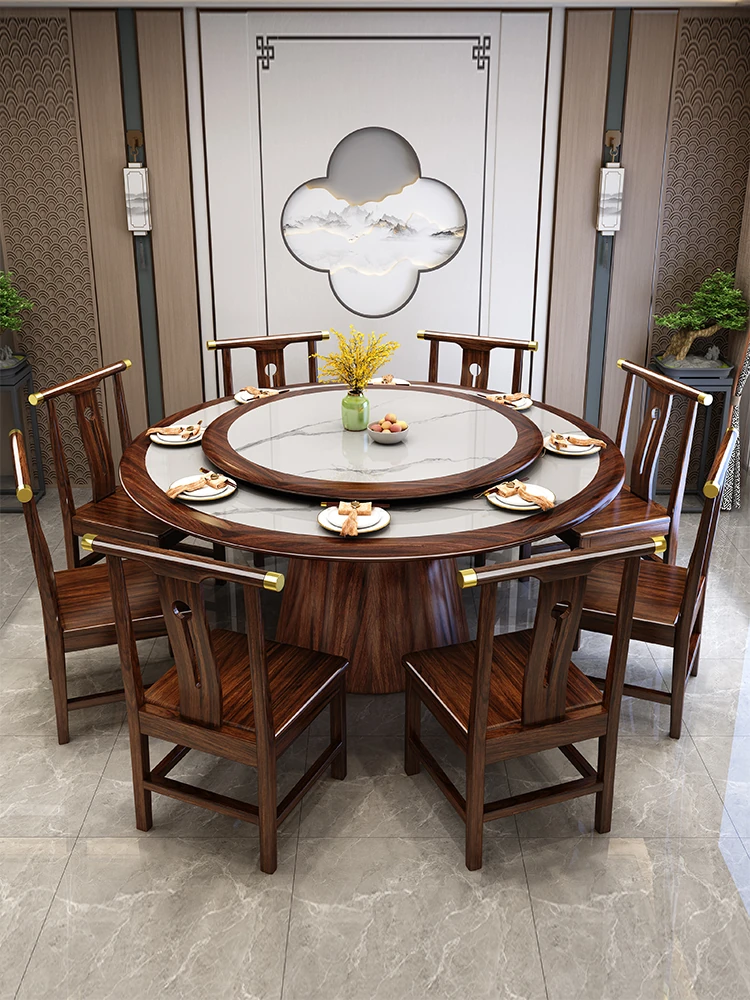 Premium New Chinese Style Black Gold Wood Round Dining Table Set - Solid Wood Luxury 2M Large Table for Home, Restaurants, and Villas