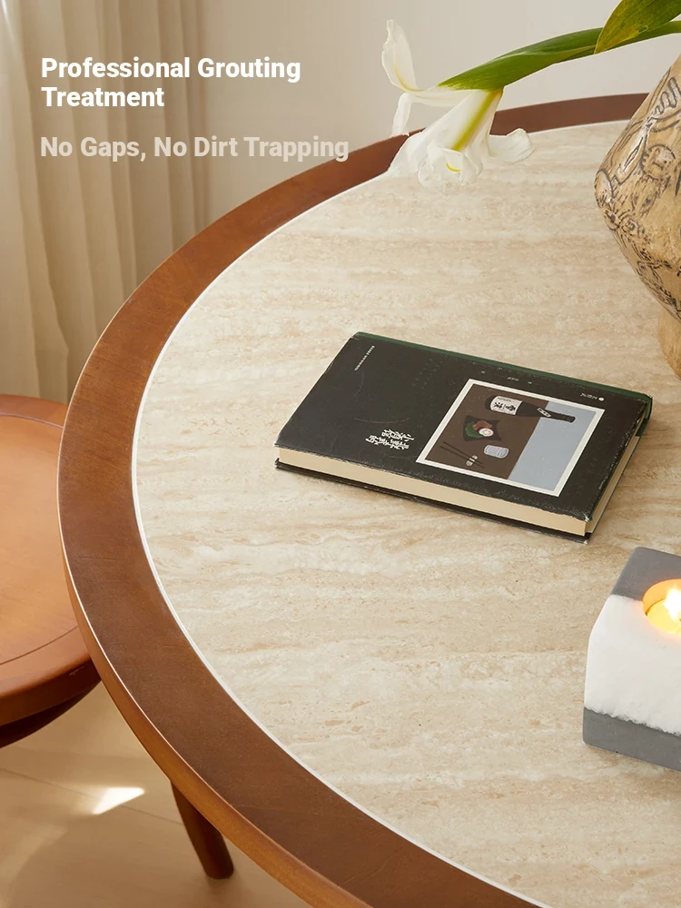 Japanese Wabi-Sabi Style Vintage Dining Table and Chair Set - Modern Minimalist Solid Wood Round Table with Elegant Black Stone Top for Home Use