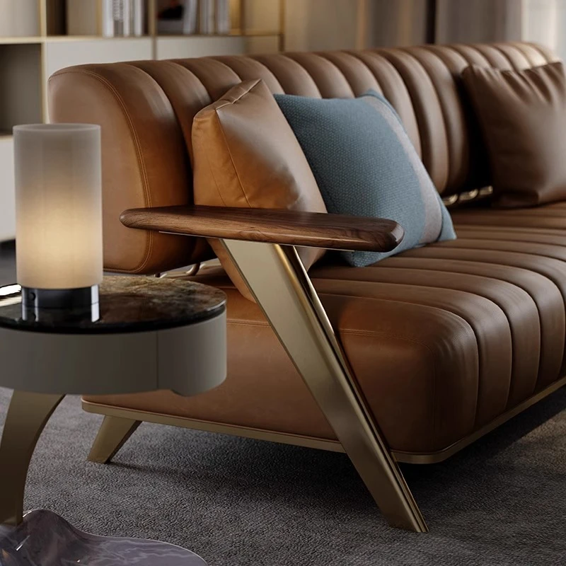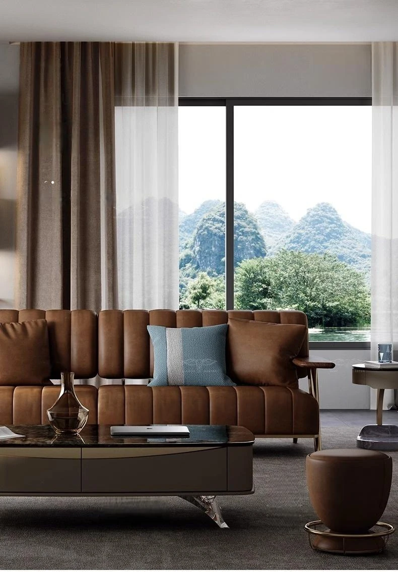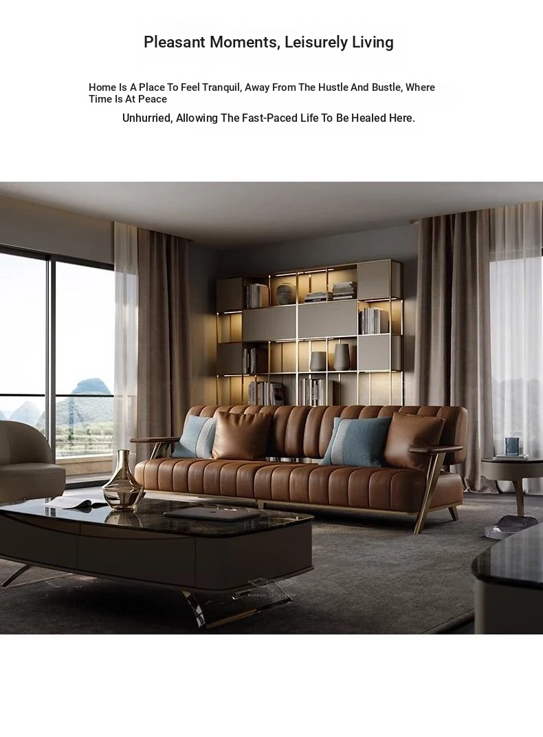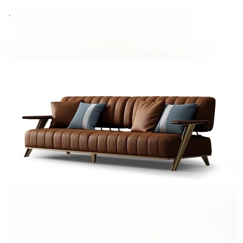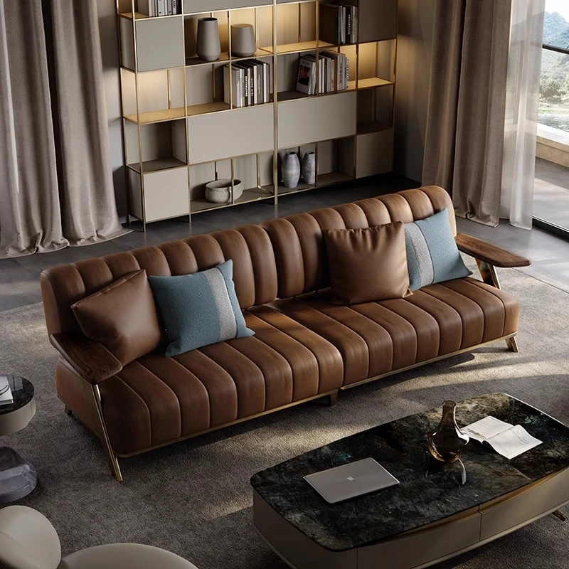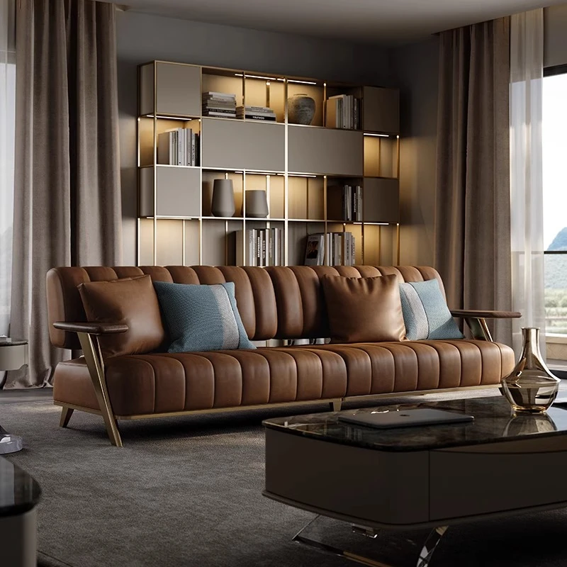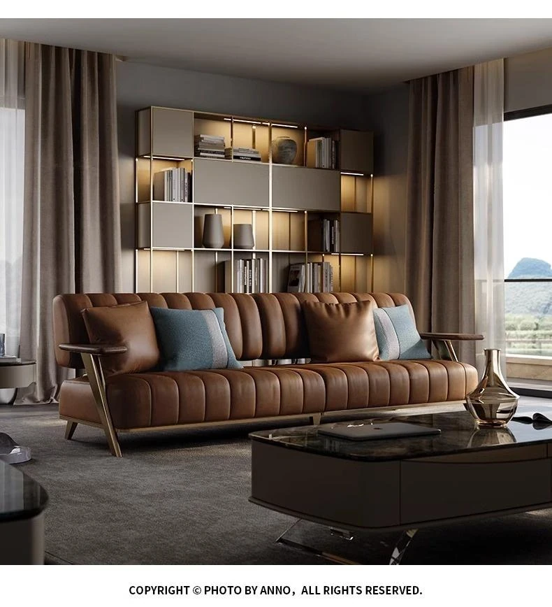 Luxurious Genuine Leather Straight Sofa for Spacious Living Room - Premium Modern Minimalist Solid Wood Furniture
