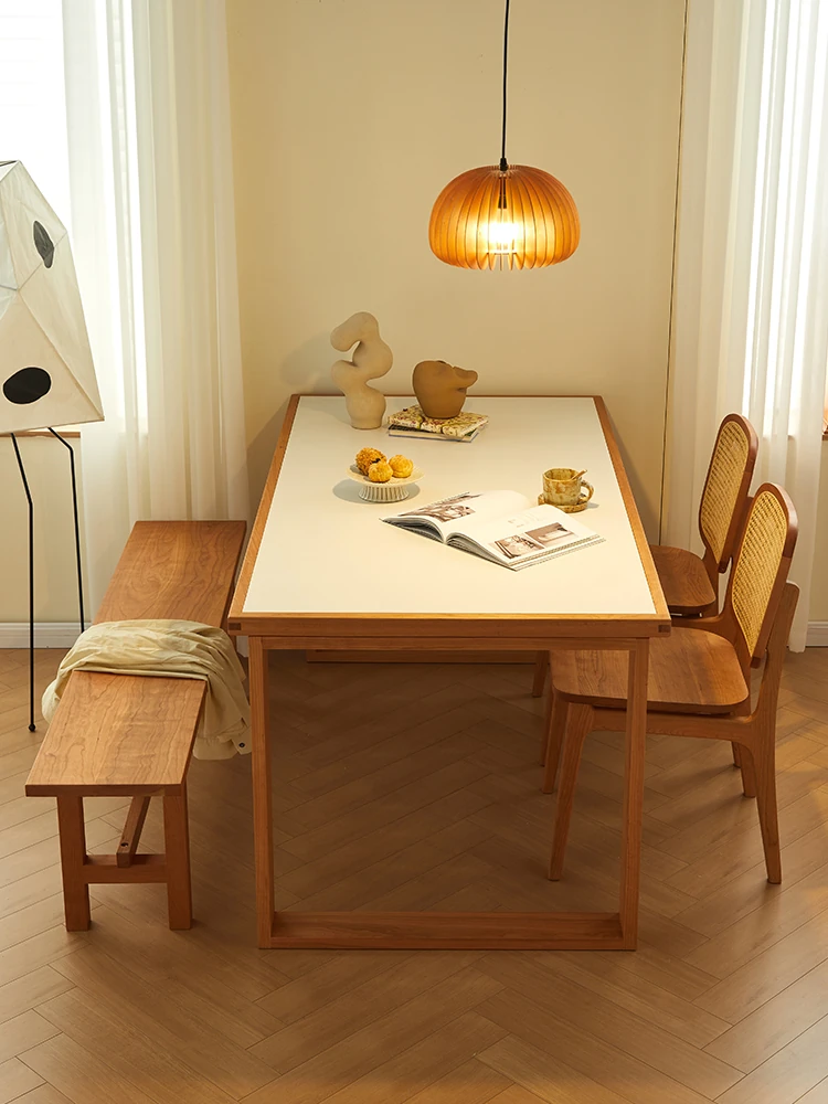 Nordic Modern Minimalist Solid Wood Dining Table - Rustic Cream Finish, Perfect for Small Spaces, Featuring White Ash Wood and Rectangular Stone Top – Ideal for Home Dining Experience