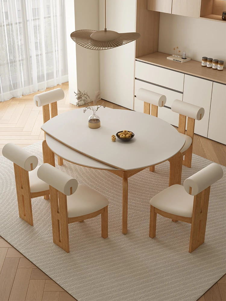 Creamy Wind Rock Plate Dining Table and Chair Set - Space-Saving, Expandable Solid Wood Rectangular Table that Converts to Round for Small Homes