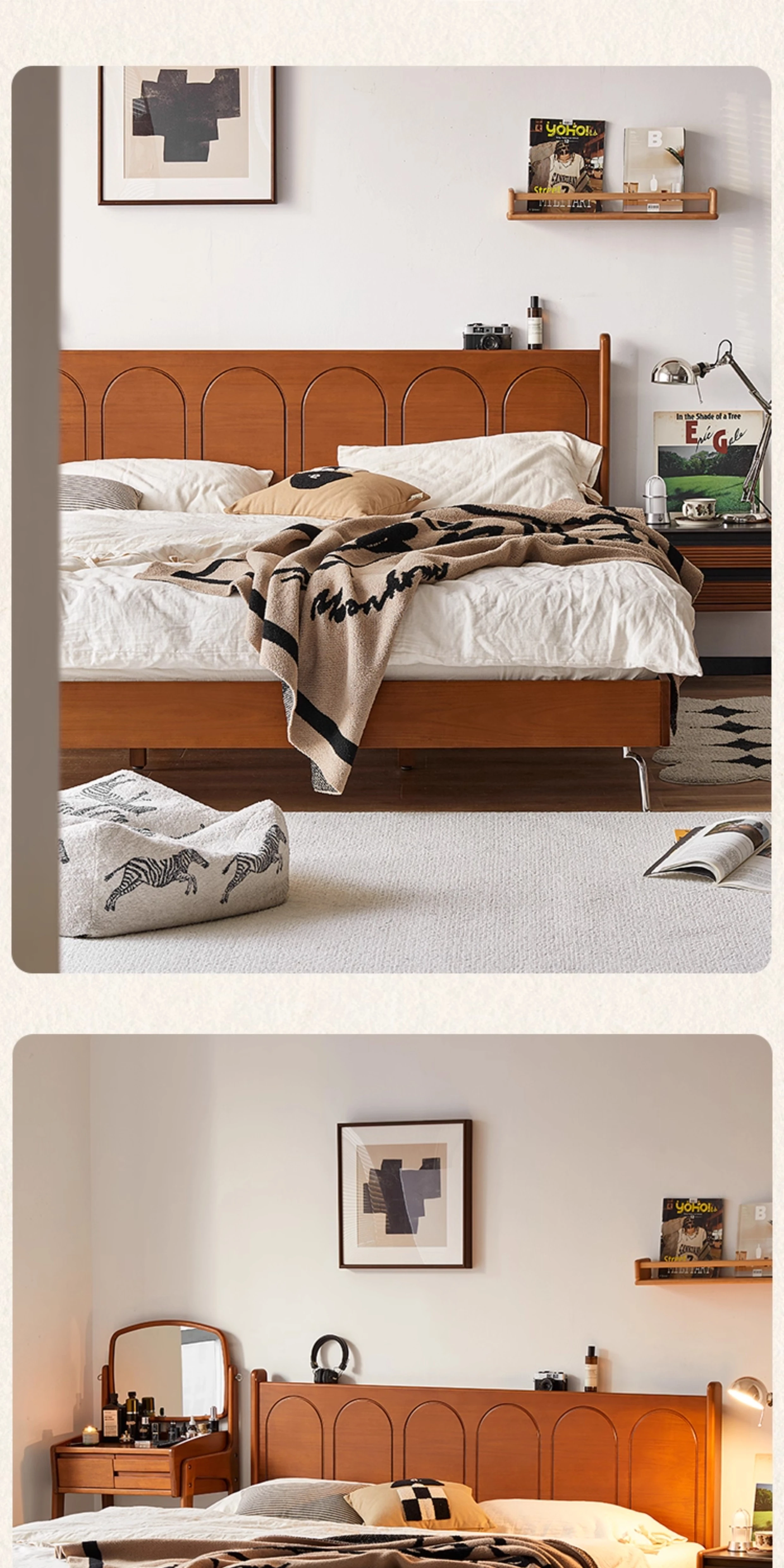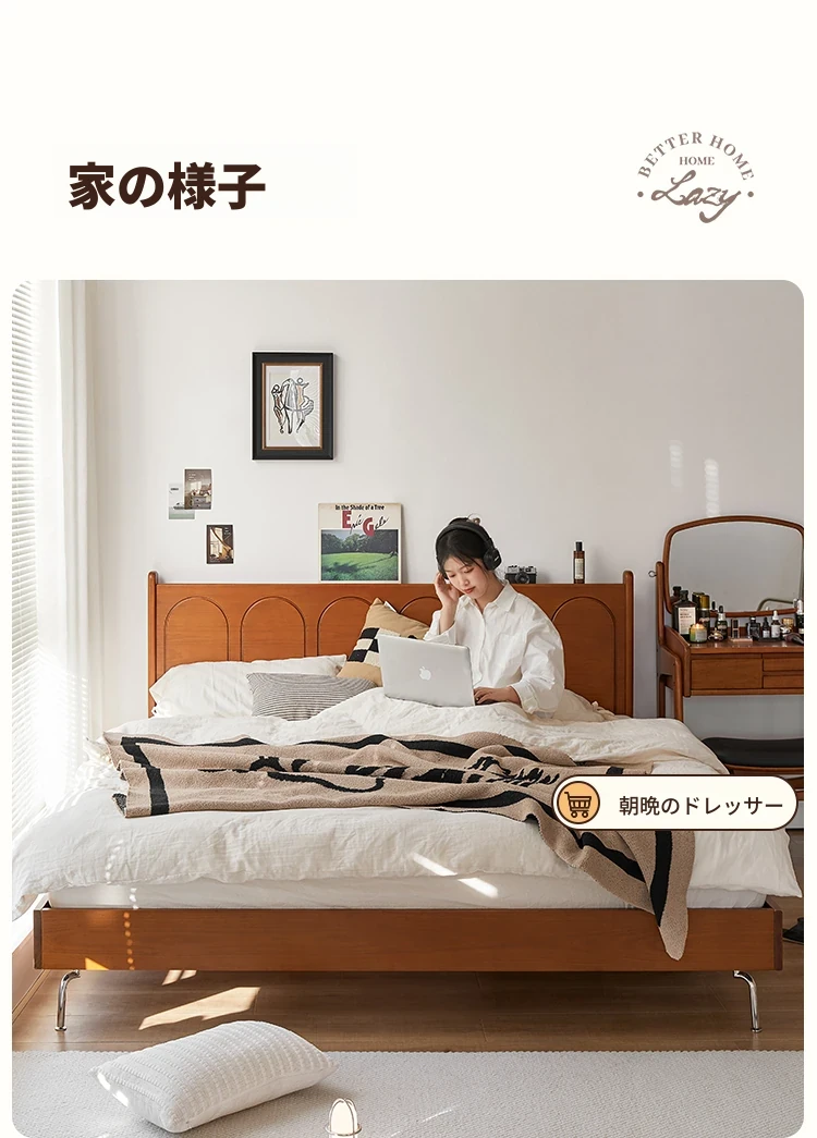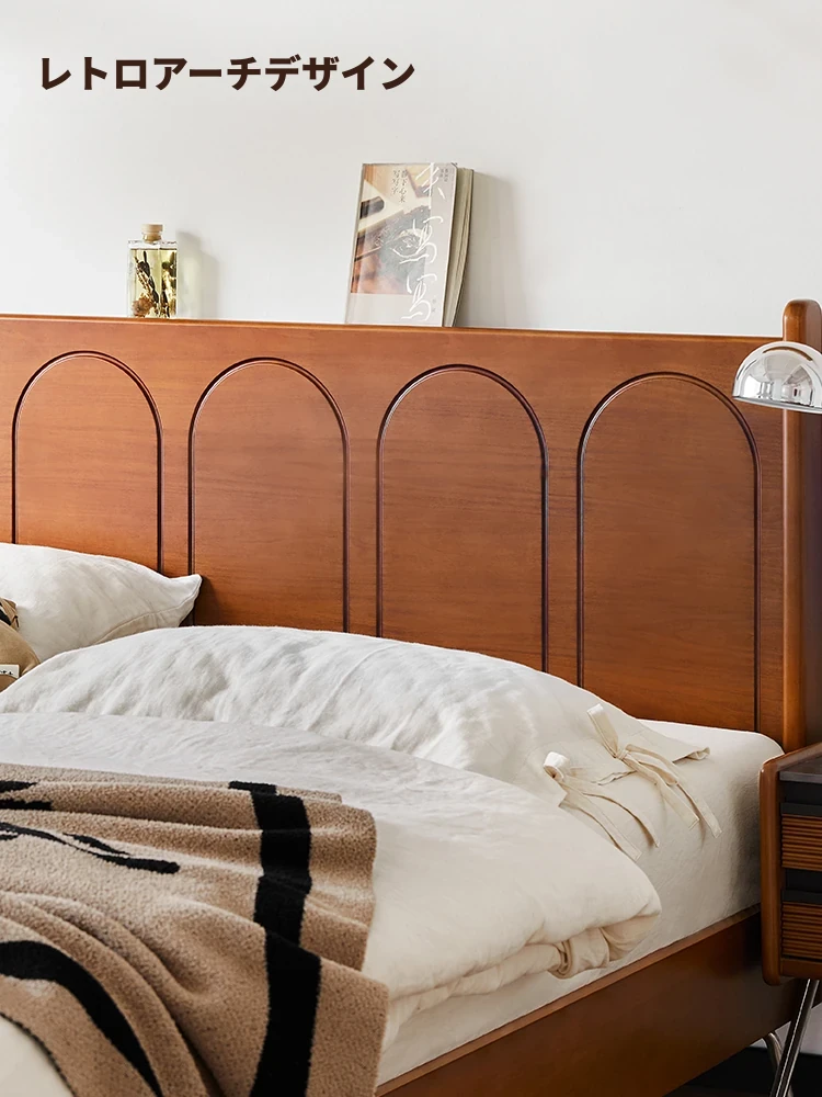 (さよなら特別版)栗の公園の無垢材ベッド 中古風ウォールナット色 1.8m 主寝室用 フレンチスタイル浮遊ダブルベッド - 高級感あふれるデザインで、心地よい眠りを提供します!