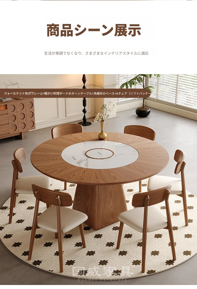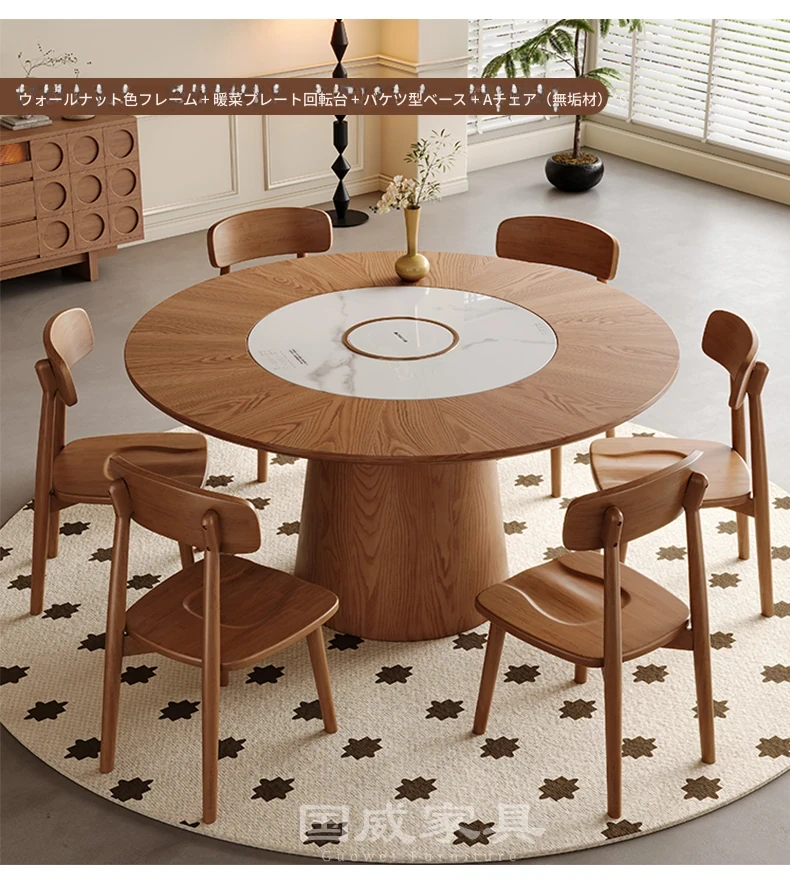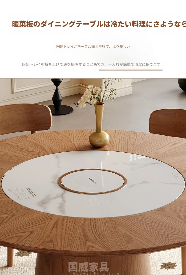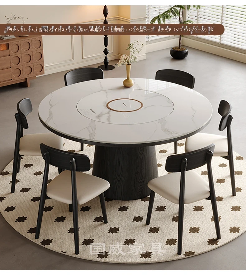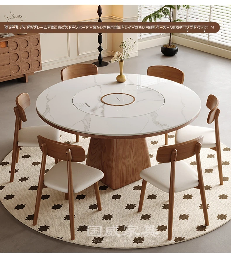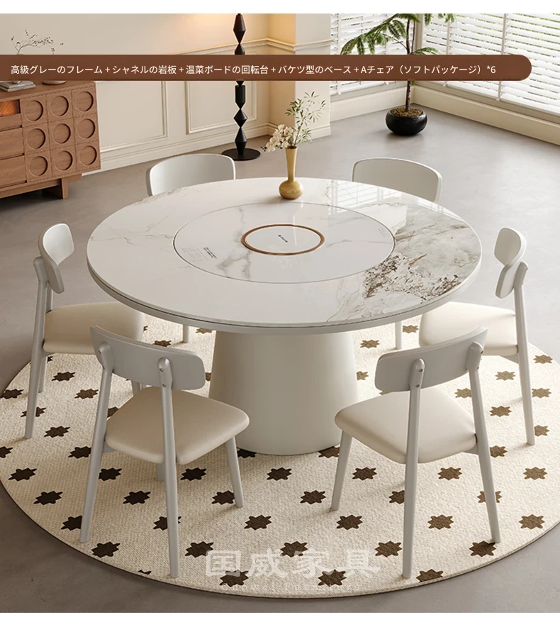 高級岩板ダイニングテーブルセット - シンプルでラグジュアリーな実木製の大丸テーブル、コンパクトな小型住宅に最適、内蔵暖かい料理用ボード付きの機能的な食卓。