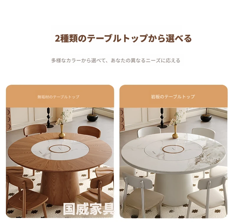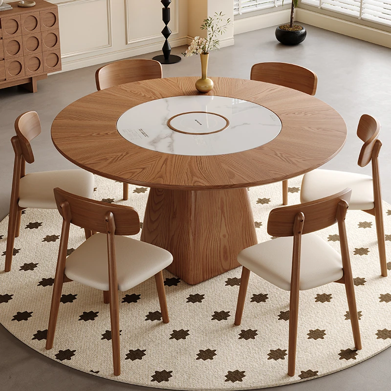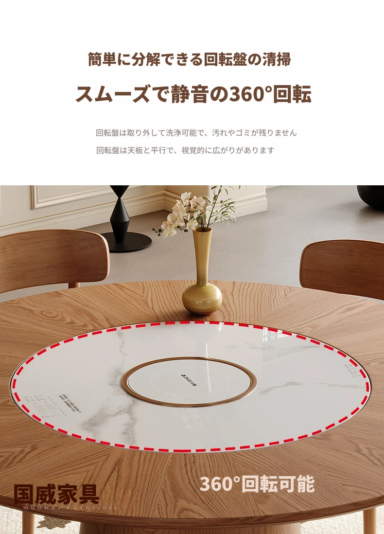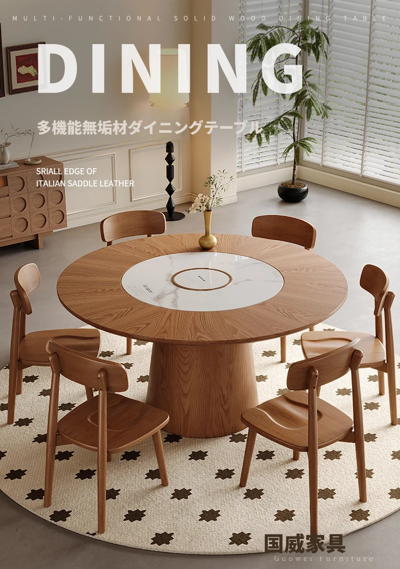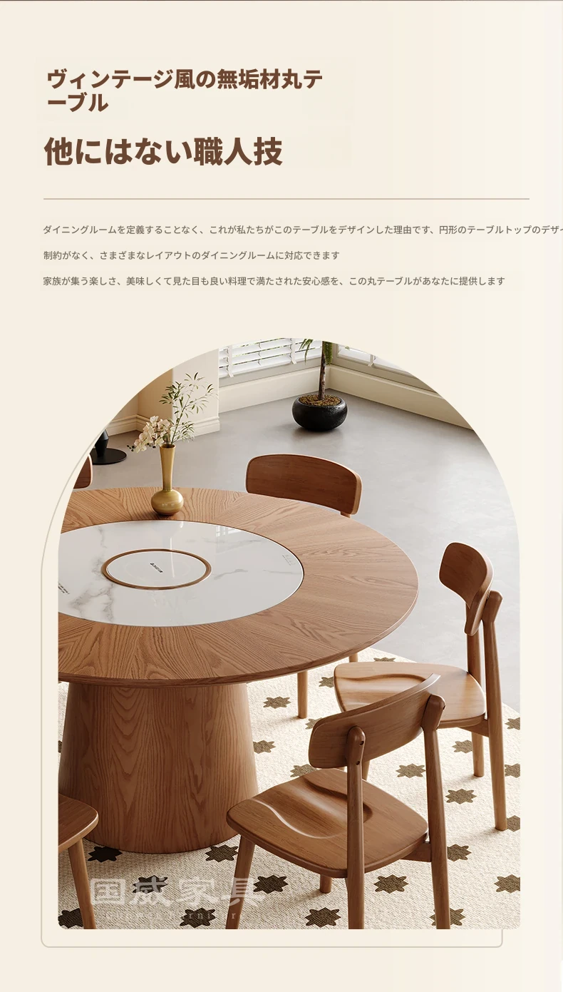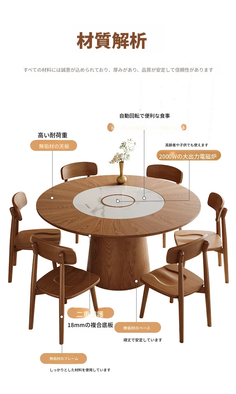 高級岩板ダイニングテーブルセット - シンプルでラグジュアリーな実木製の大丸テーブル、コンパクトな小型住宅に最適、内蔵暖かい料理用ボード付きの機能的な食卓。