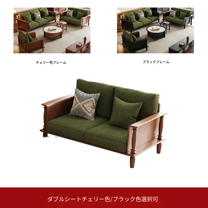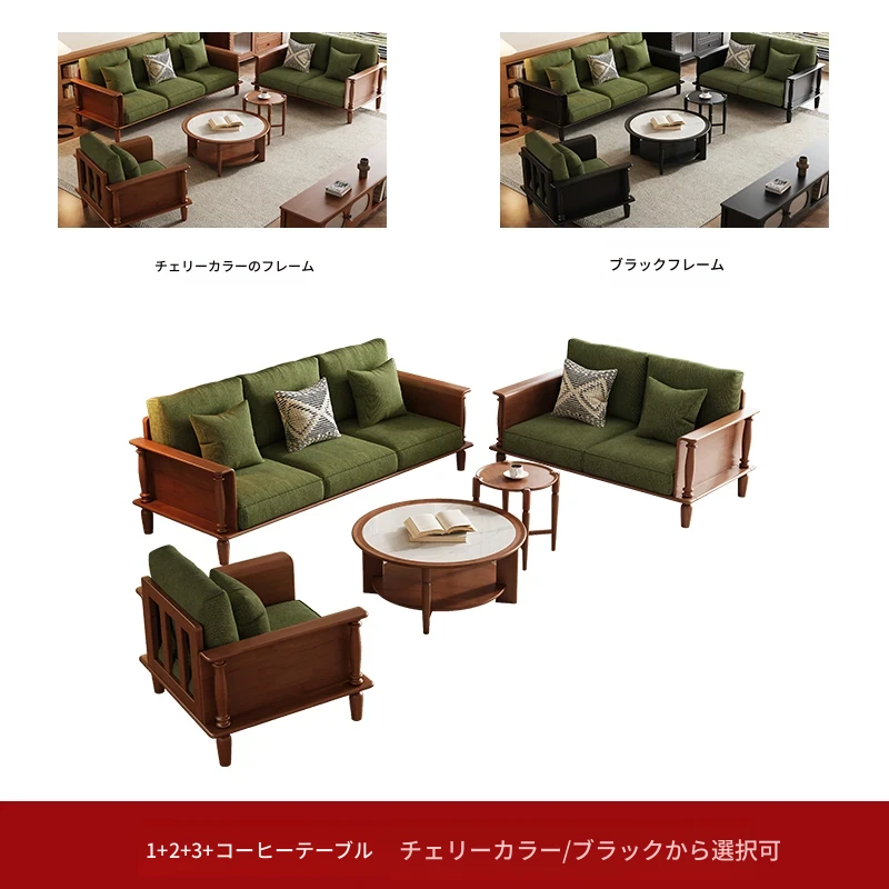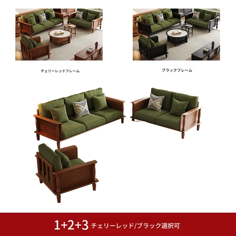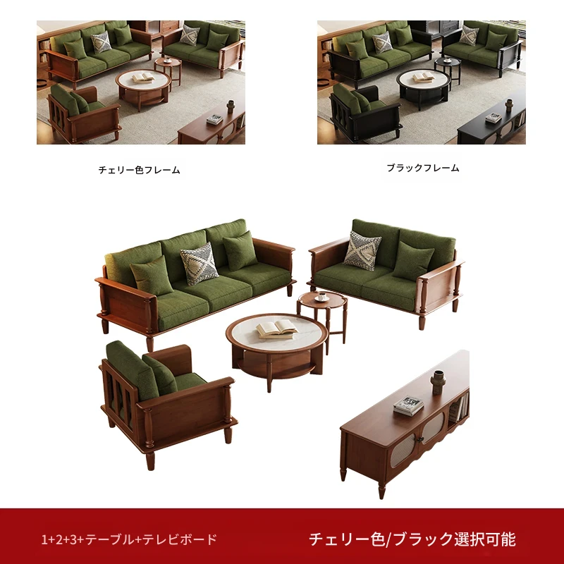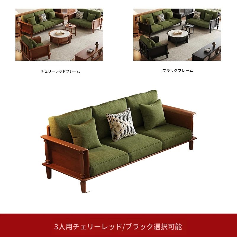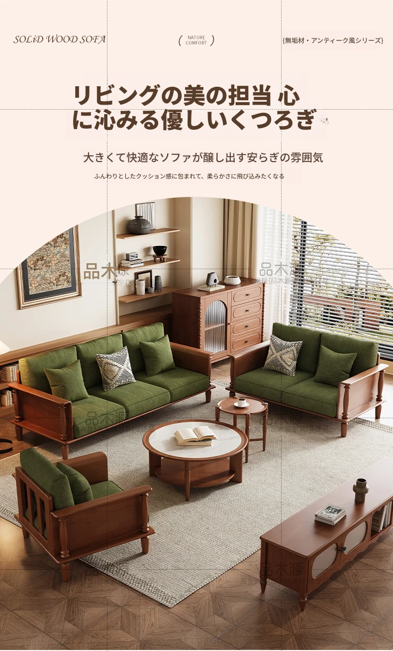 アメリカンヴィンテージ全木製ソファセット 中古風リビング 小型3人掛けストレートグリーンクラウドソファ - おしゃれで快適な空間を演出!