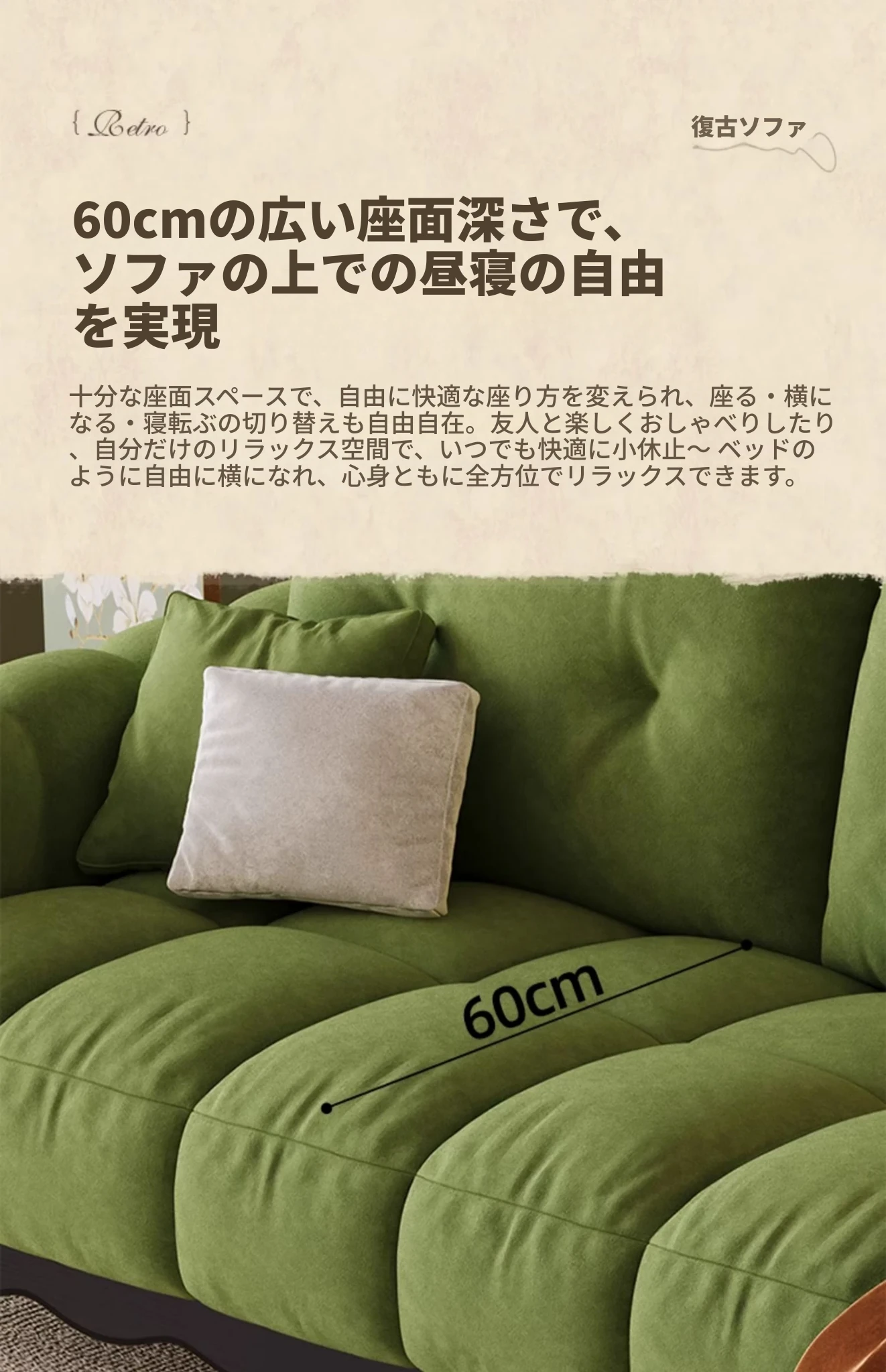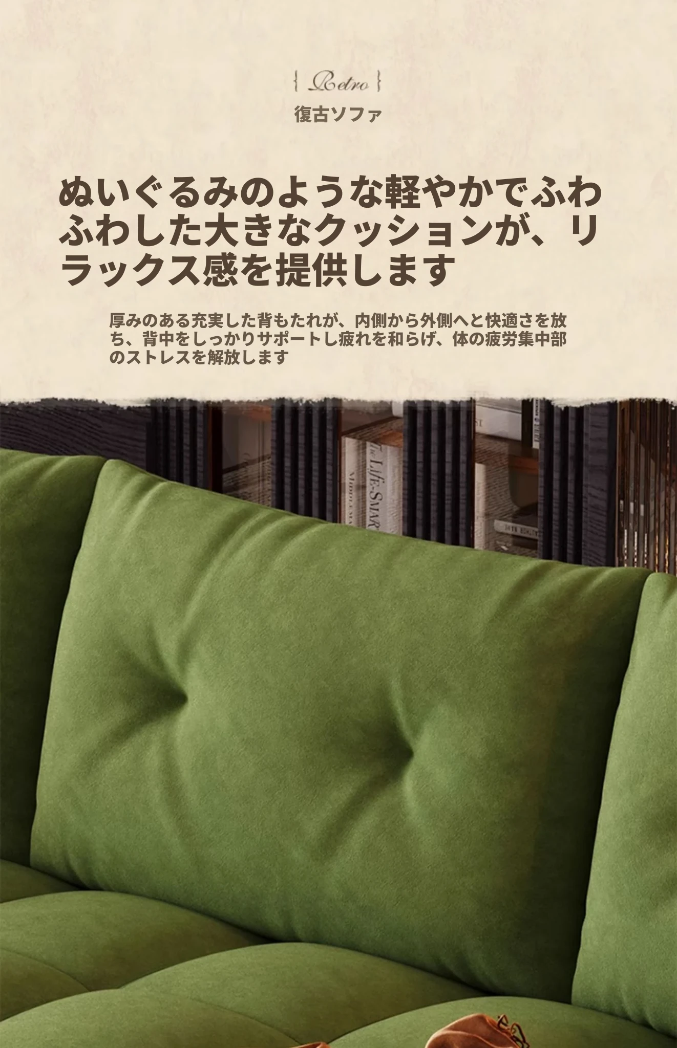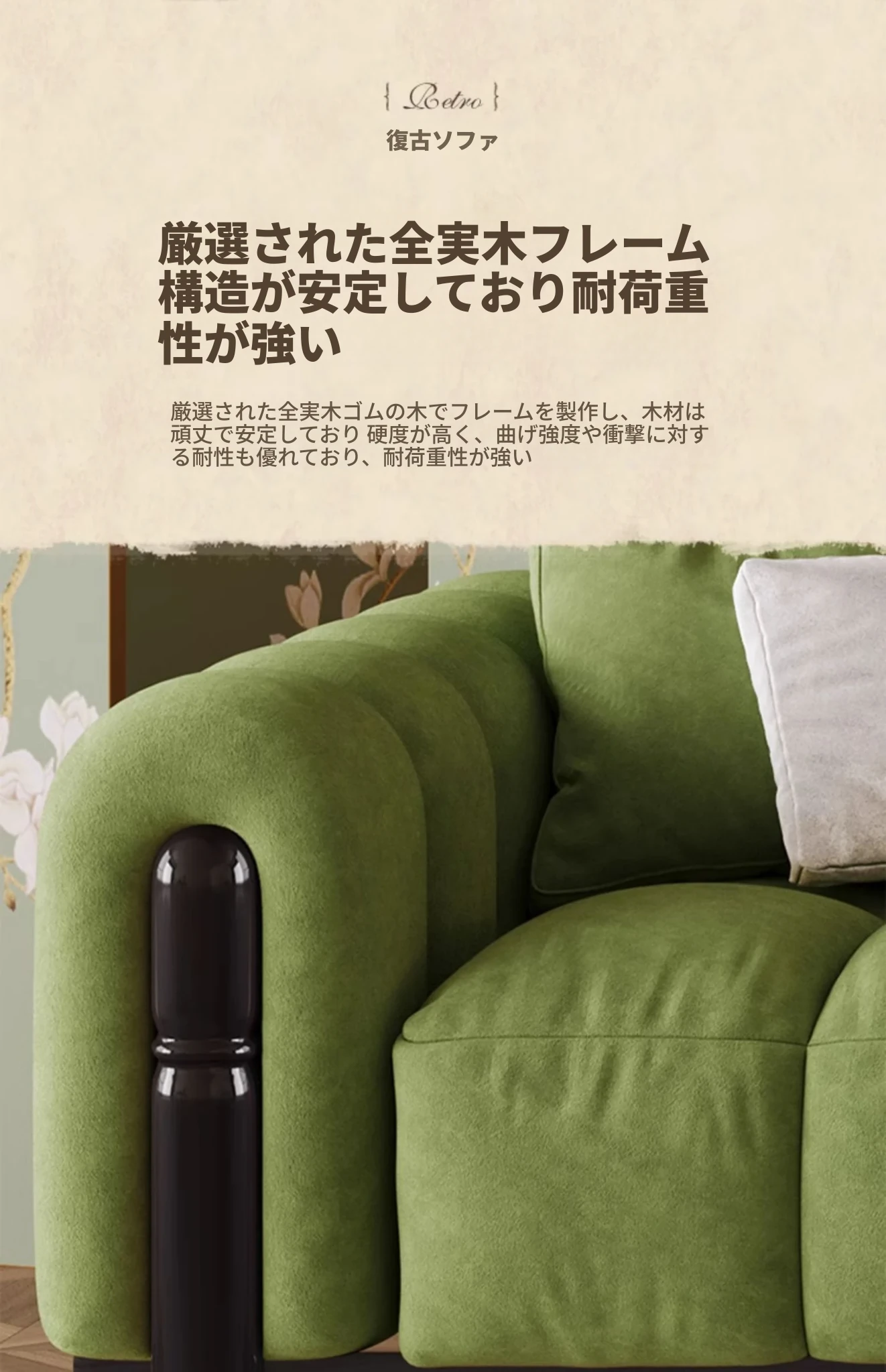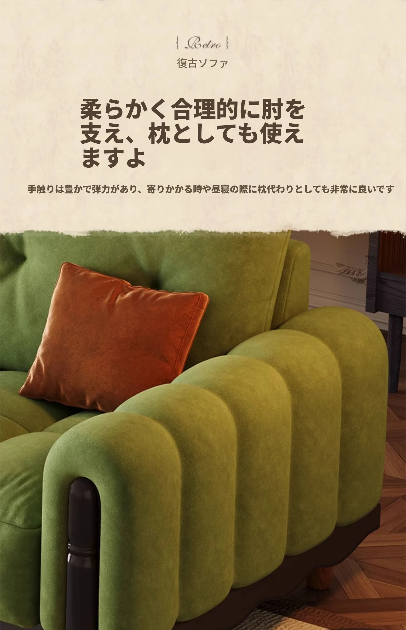 2024年新作!フレンチヴィンテージスタイルの無垢材ソファ - リビングにぴったりなグリーンの布張りピアノキー直列ソファ。クラシックな美しさと快適な座り心地を兼ね備えた一品です!