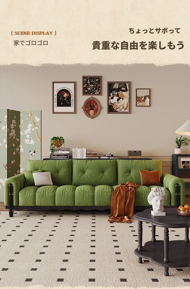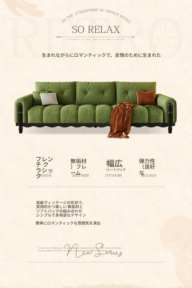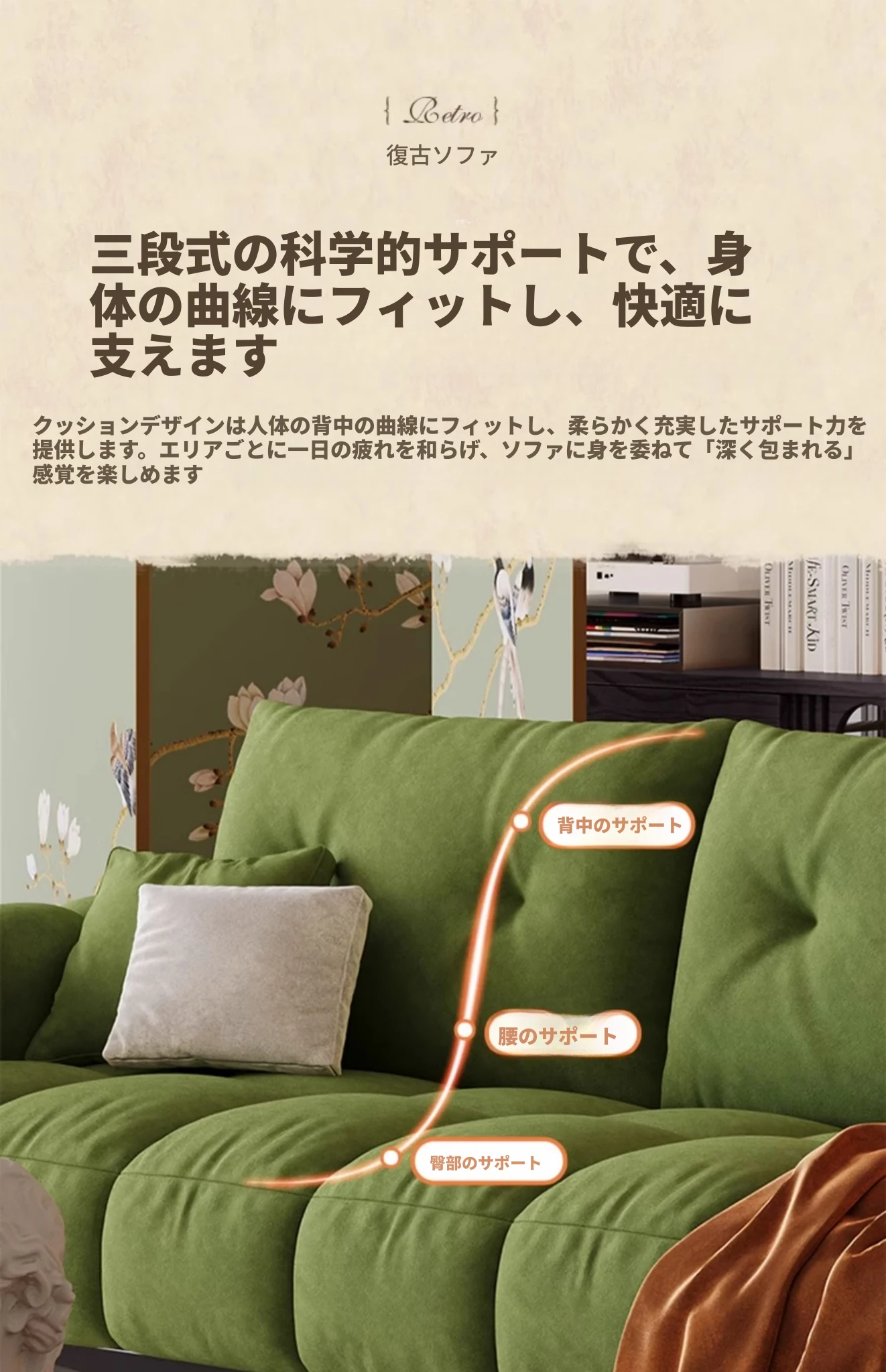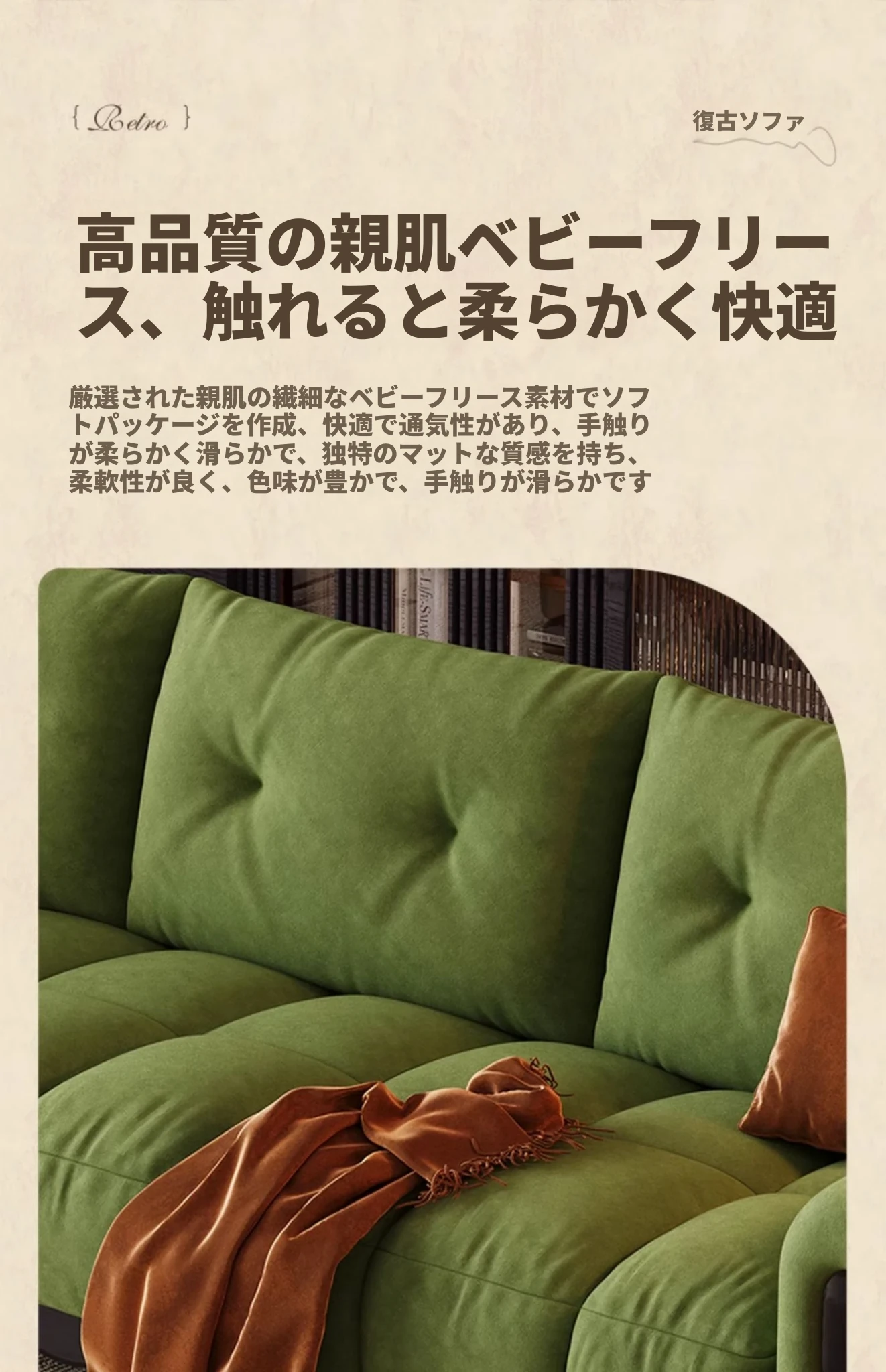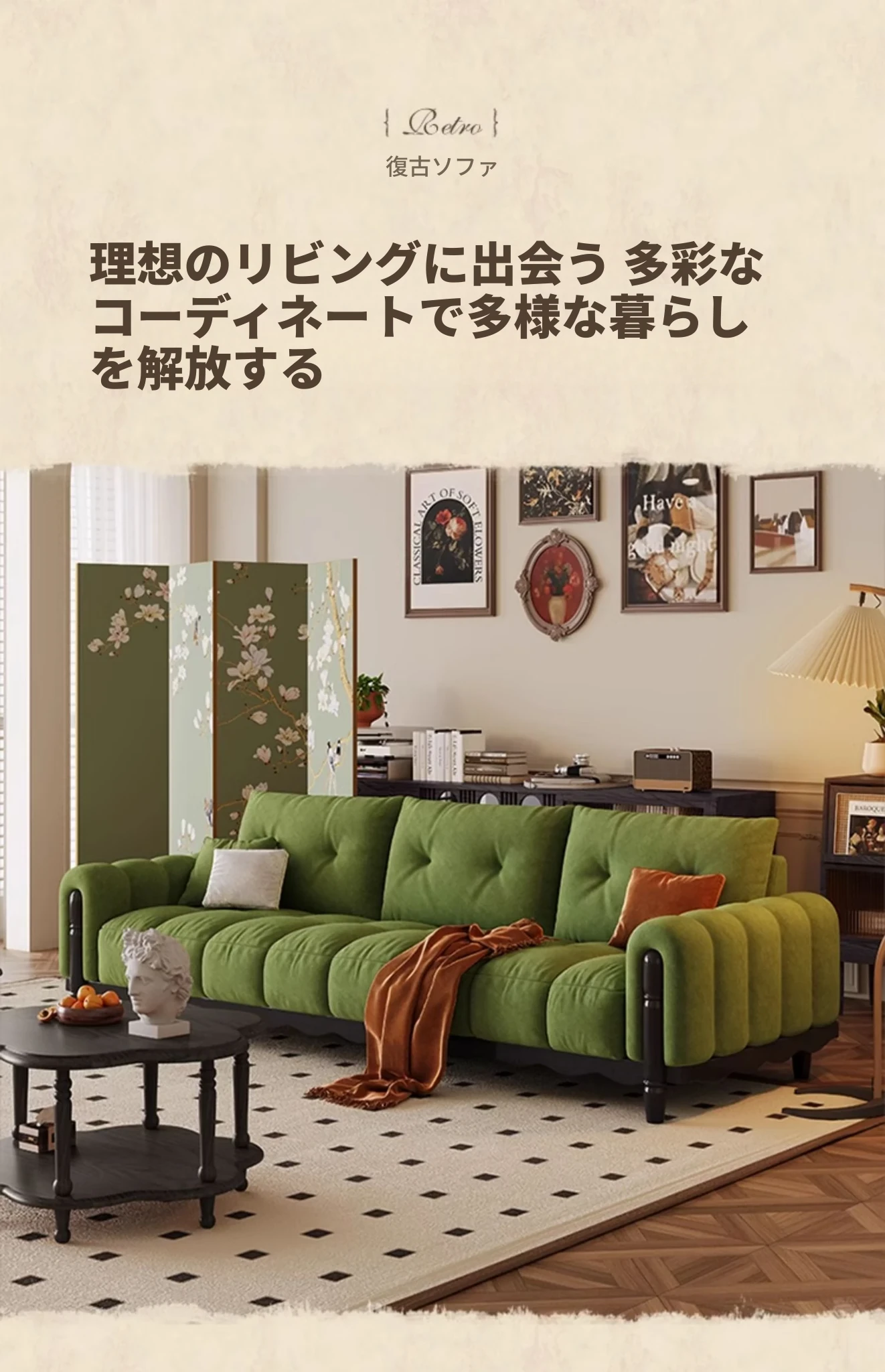 2024年新作!フレンチヴィンテージスタイルの無垢材ソファ - リビングにぴったりなグリーンの布張りピアノキー直列ソファ。クラシックな美しさと快適な座り心地を兼ね備えた一品です!