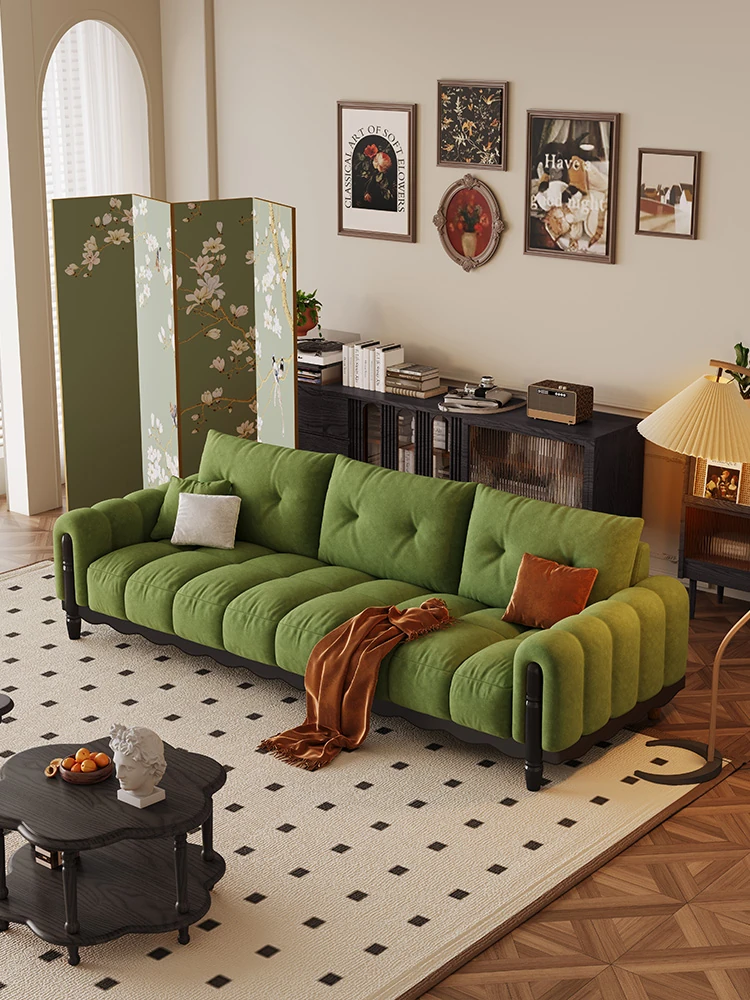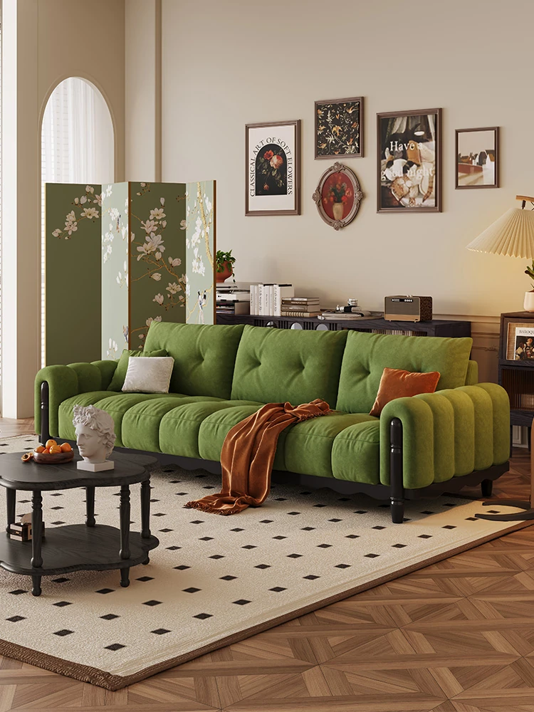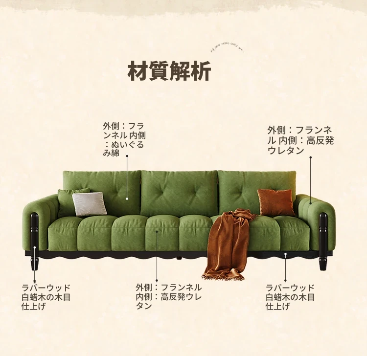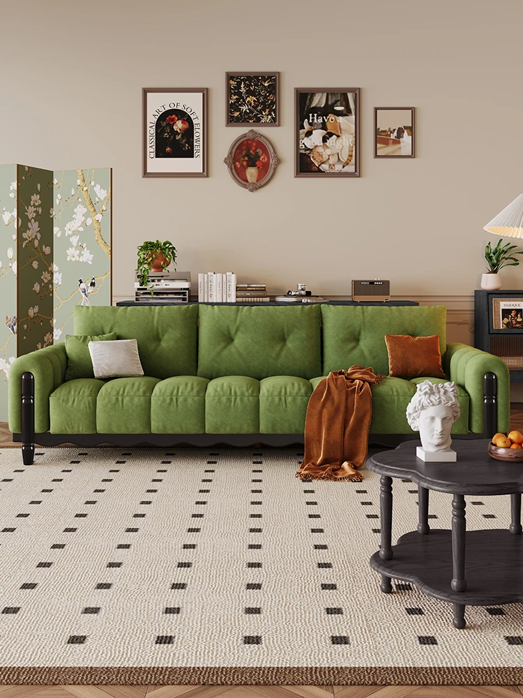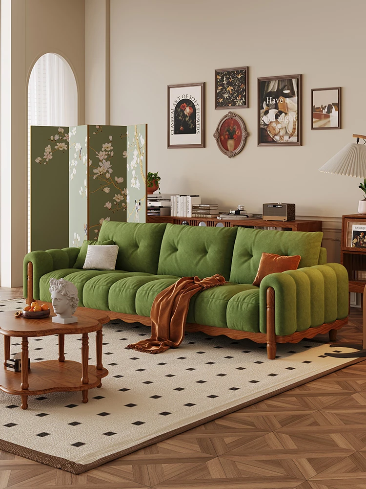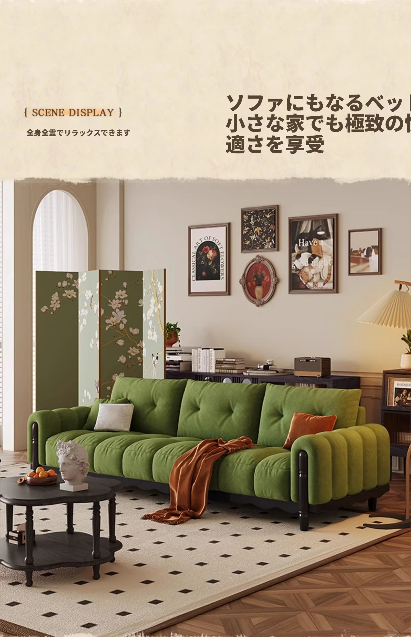2024年新作!フレンチヴィンテージスタイルの無垢材ソファ - リビングにぴったりなグリーンの布張りピアノキー直列ソファ。クラシックな美しさと快適な座り心地を兼ね備えた一品です!