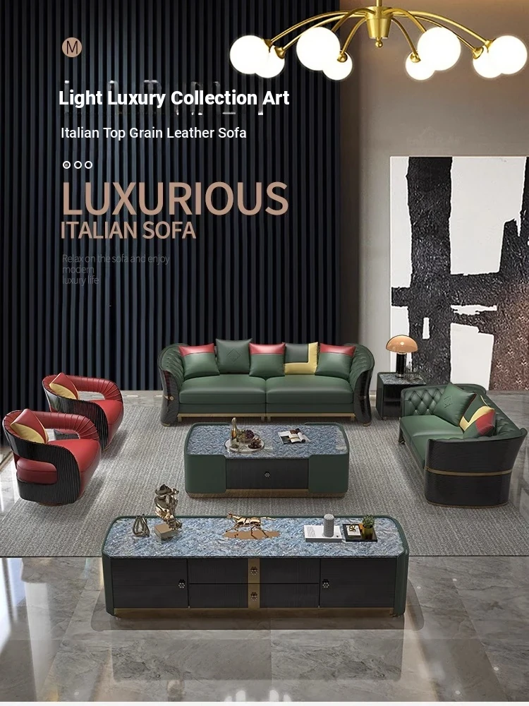 Italian Luxury Genuine Leather Sofa - High-End Elegant Design for Villas and Mansions, Perfect for Spacious Living Rooms and Upscale Interiors