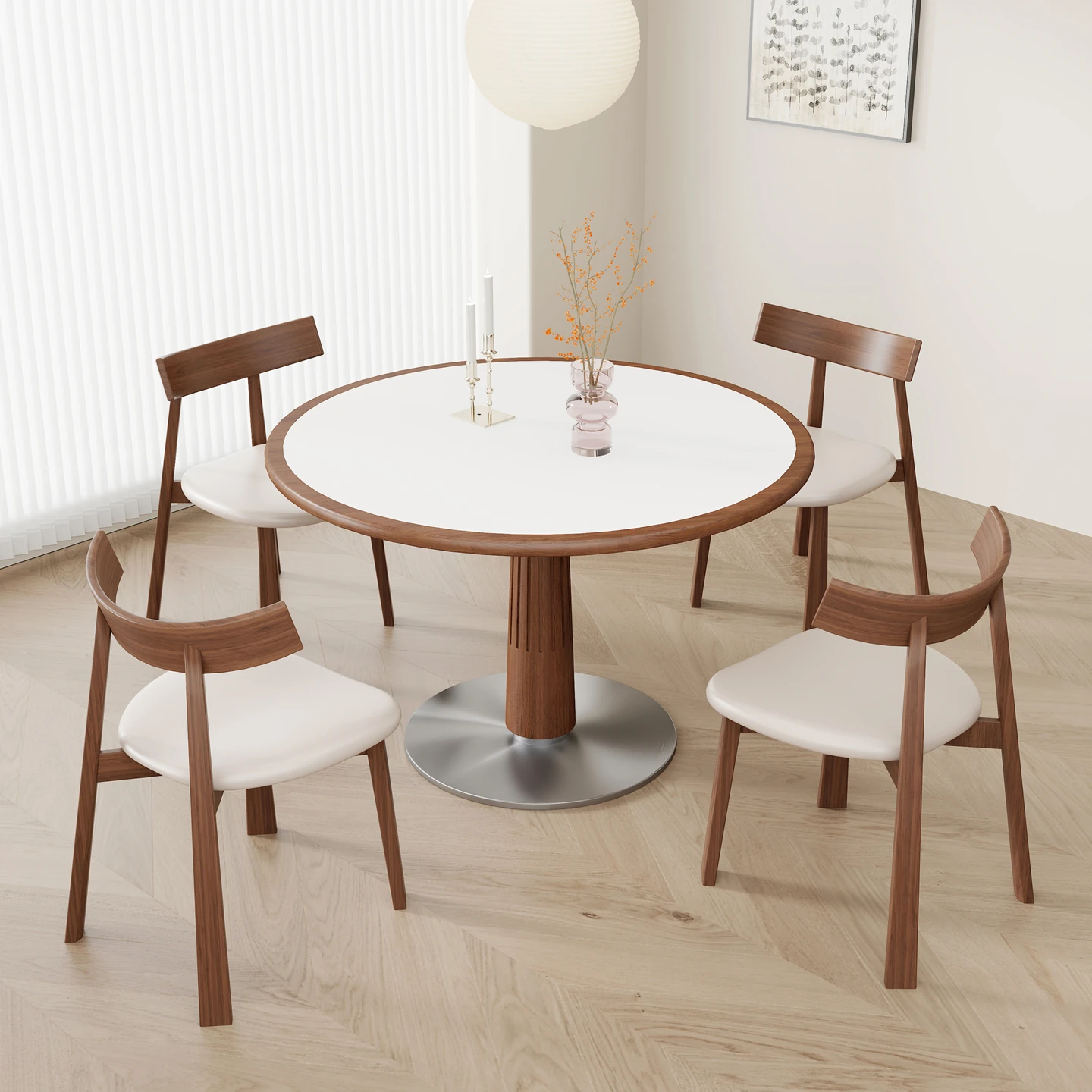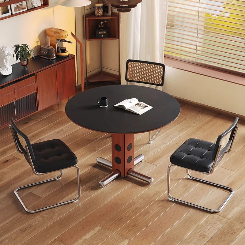 フレンチヴィンテージ風の無垢材ロックボード円形ダイニングテーブル|小型住宅にぴったりのステンレス製レトロ貝殻デザインのダイニングテーブル&椅子セット!おしゃれで機能的な空間を演出!