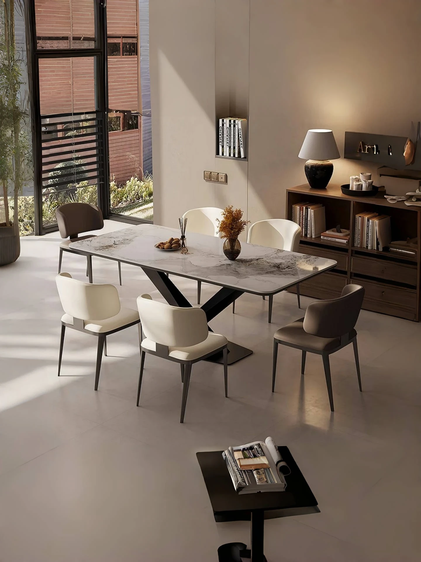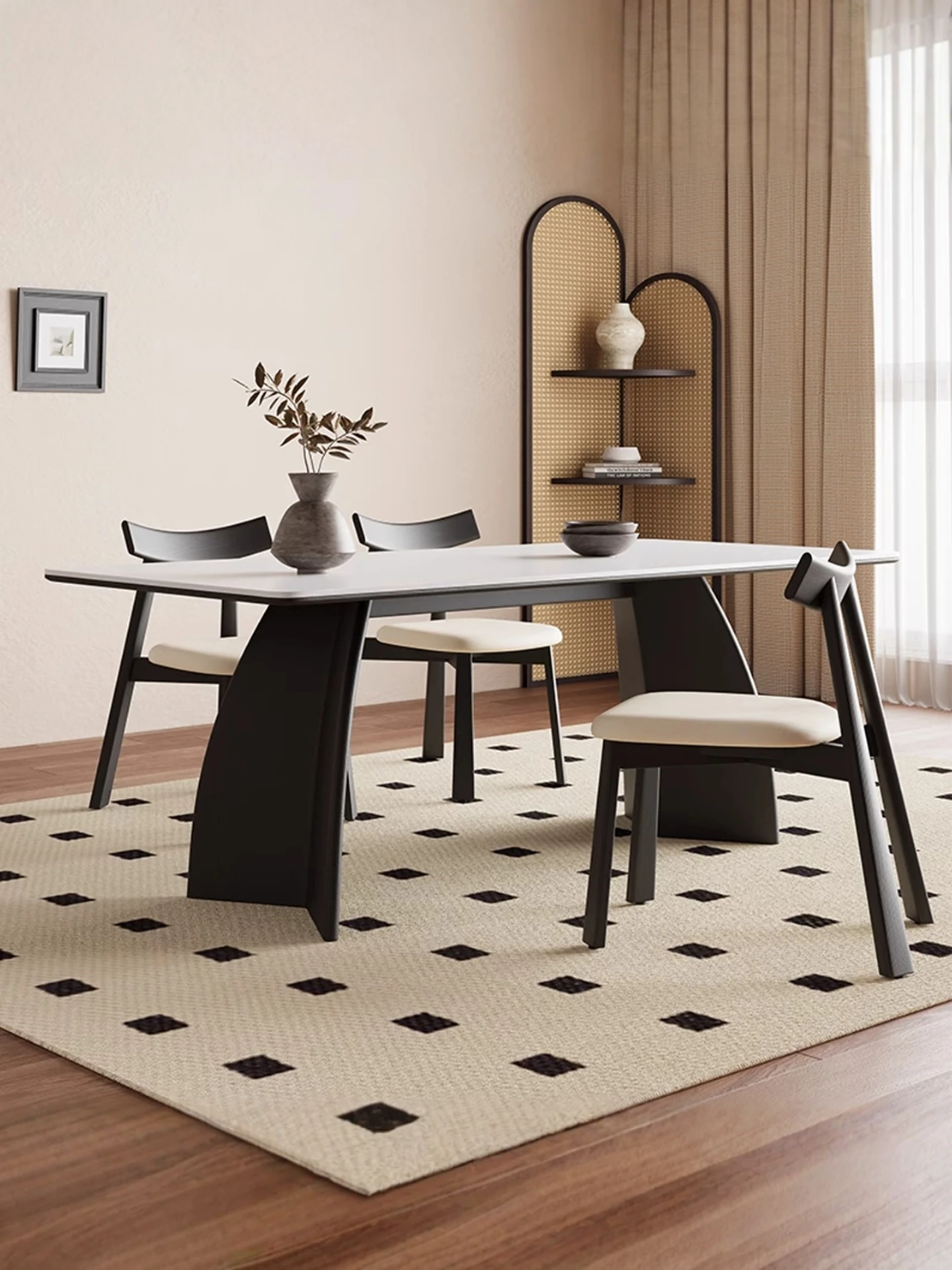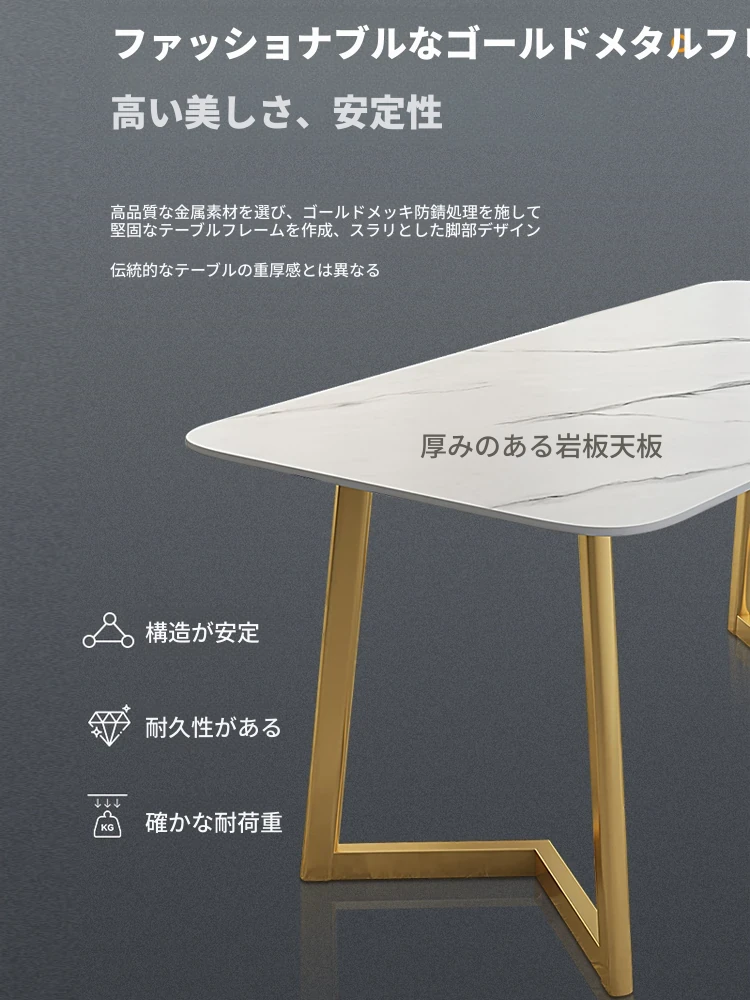 モダンミニマリストの岩板ダイニングテーブルセット - 小型住宅に最適な高級感溢れる長方形テーブルと椅子の組み合わせで、食事の時間を特別なひとときに演出します。