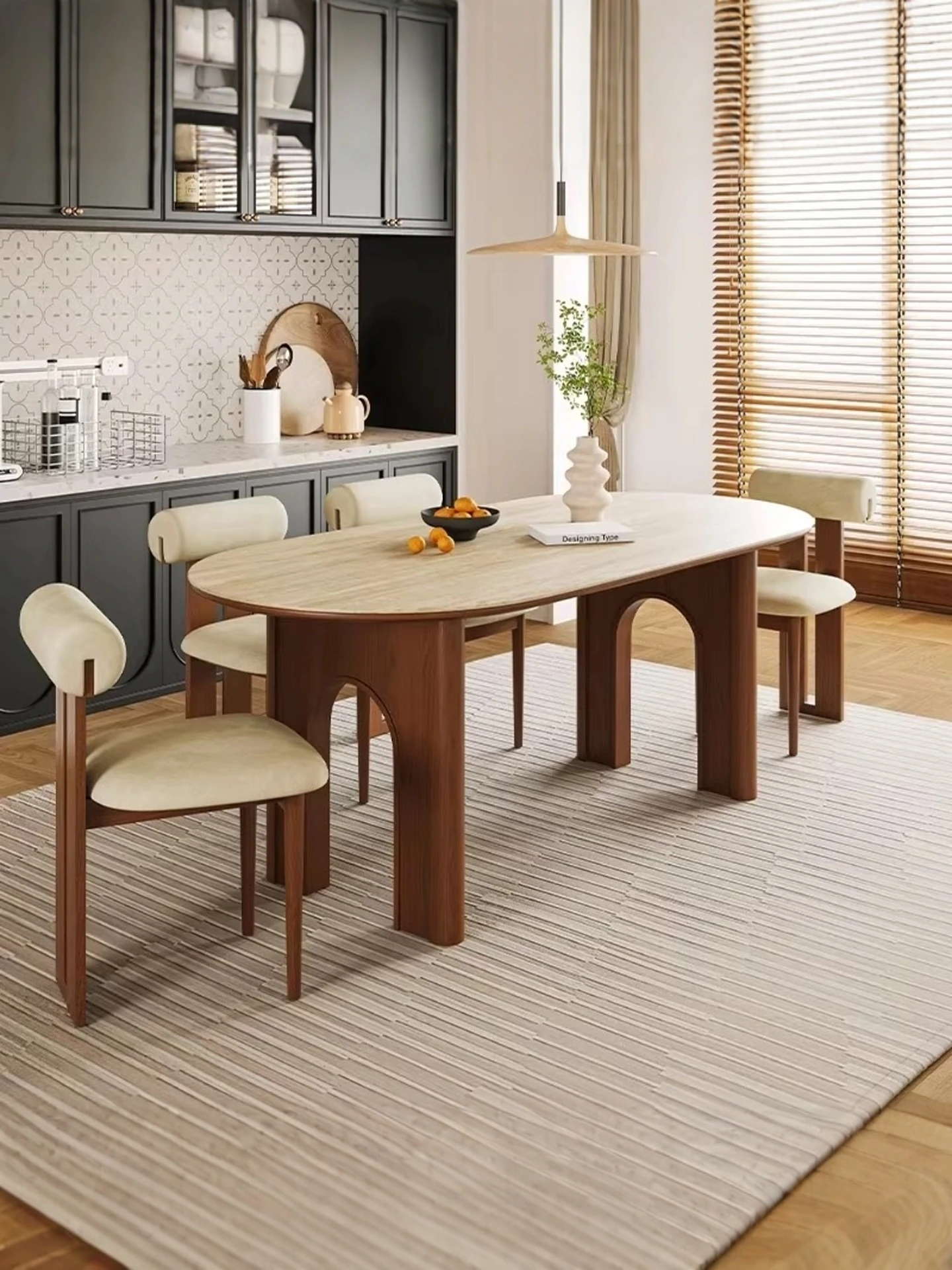 中古風アーチ型ダイニングテーブルセット|本物の木製&岩板使用|軽やかなフレンチスタイル|侘寂の美を感じるレトロエレガンス|エレガントな楕円形デザインで特別な食卓を演出!